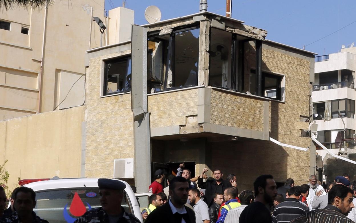 | Một quan chức an ninh của thành phố Beirut nói rằng kẻ đánh bom đầu tiên đã lái một xe máy cùng khoảng 2 kg thuốc nổ tới cổng chính của sứ quán. Sau khi dừng xe tại đây, anh ta đã kích nổ khối bom. Ảnh: AP. |