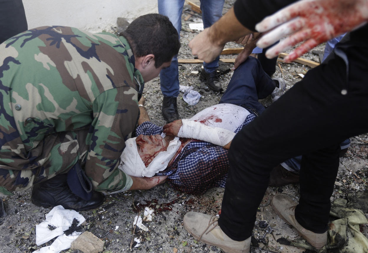 | Binh sĩ Lebanon giúp một người phụ nữ bị thương tại hiện trường vụ nổ. Ảnh: AP. |