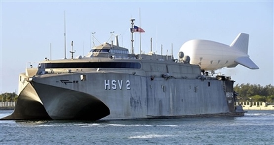 | Tàu vận tải 2 thân HSV 2 Swift mang theo khinh khí cấu TIF-25K. |