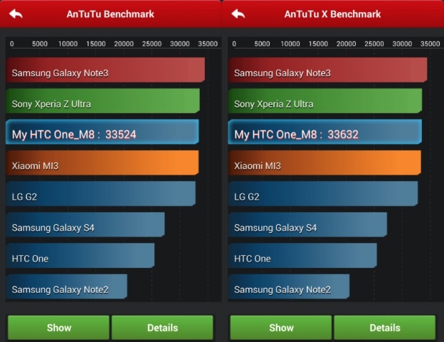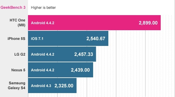 Thử nghiệm với ứng dụng GeekBench 3, One M8 có hiệu suất cao hơn so với iPhone 5S, LG G2, Nexus 5 và Galaxy S4. Đây đều là những model của năm 2013 và kết quả này không mang lại bất ngờ.