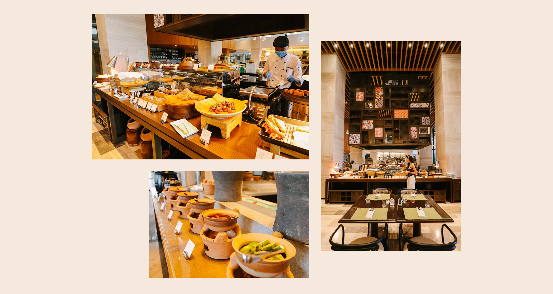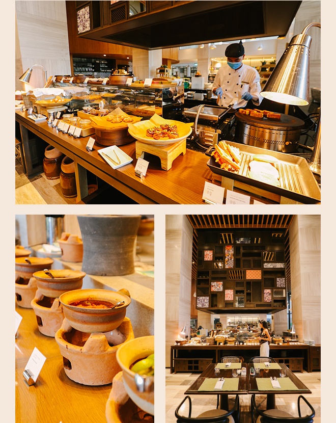 Buffet được phục vụ tại Sora & Umi. Món ăn ở đây khá đa dạng từ hương vị Á sang Tây, ẩm thực thuần Việt có hương vị vượt trội hơn. Bạn nên dùng thử phở, bún bò, cháo trắng ăn kèm trứng muối… Điểm nhấn của nhà hàng này là các khu vực bếp mở, tôi có thể quan sát nhân viên chế biến món Việt ngay tại quầy.