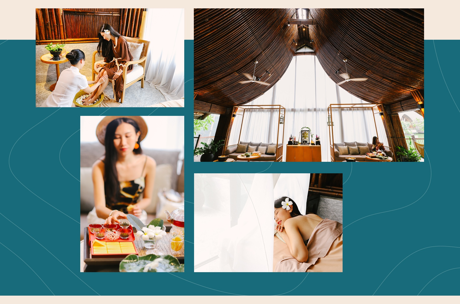 Kiến trúc và nội thất mang thiên hướng tự nhiên với tre, gỗ, nhìn ra hồ nước trồng sen. Trong lúc chờ vào phòng massage, tôi tựa mình trên ghế sofa, uống ly trà thảo mộc nóng và ngắm mưa.