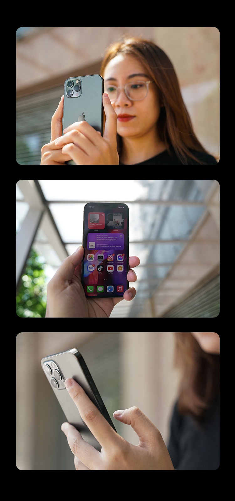 Đến tháng 10, Apple ra mắt sản phẩm trong mơ ấy nhưng với tên iPhone 12 Pro. Khi lần đầu nhìn thấy máy thực tế, tôi đã rất phấn khích vì vẻ vuông vắn nam tính của nó. Nhưng đó chỉ là cảm nhận đầu tiên. Đã nhiều năm sử dụng các smartphone có khung viền được bo cong, tôi cảm thấy khá khó chịu khi lần đầu cầm iPhone 12 Pro bởi nó khá cấn tay. Bên cạnh đó, iPhone 12 Pro tương đối nặng khi nó có khối lượng 187 g. Dù máy nhẹ hơn 1 g so với iPhone 11 Pro nhưng do phần viền cấn tay đã khiến nó trông có vẻ nặng hơn khi cầm.