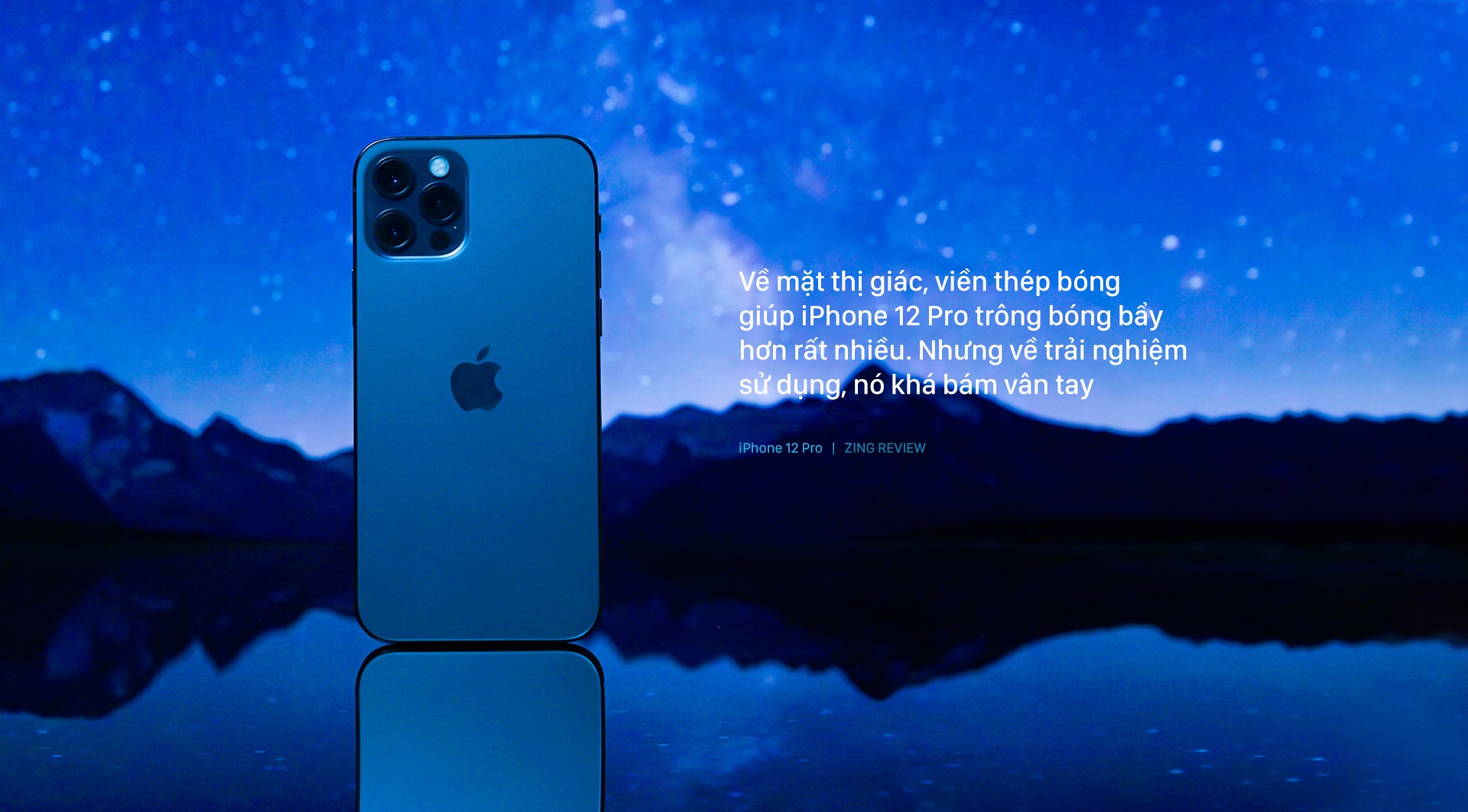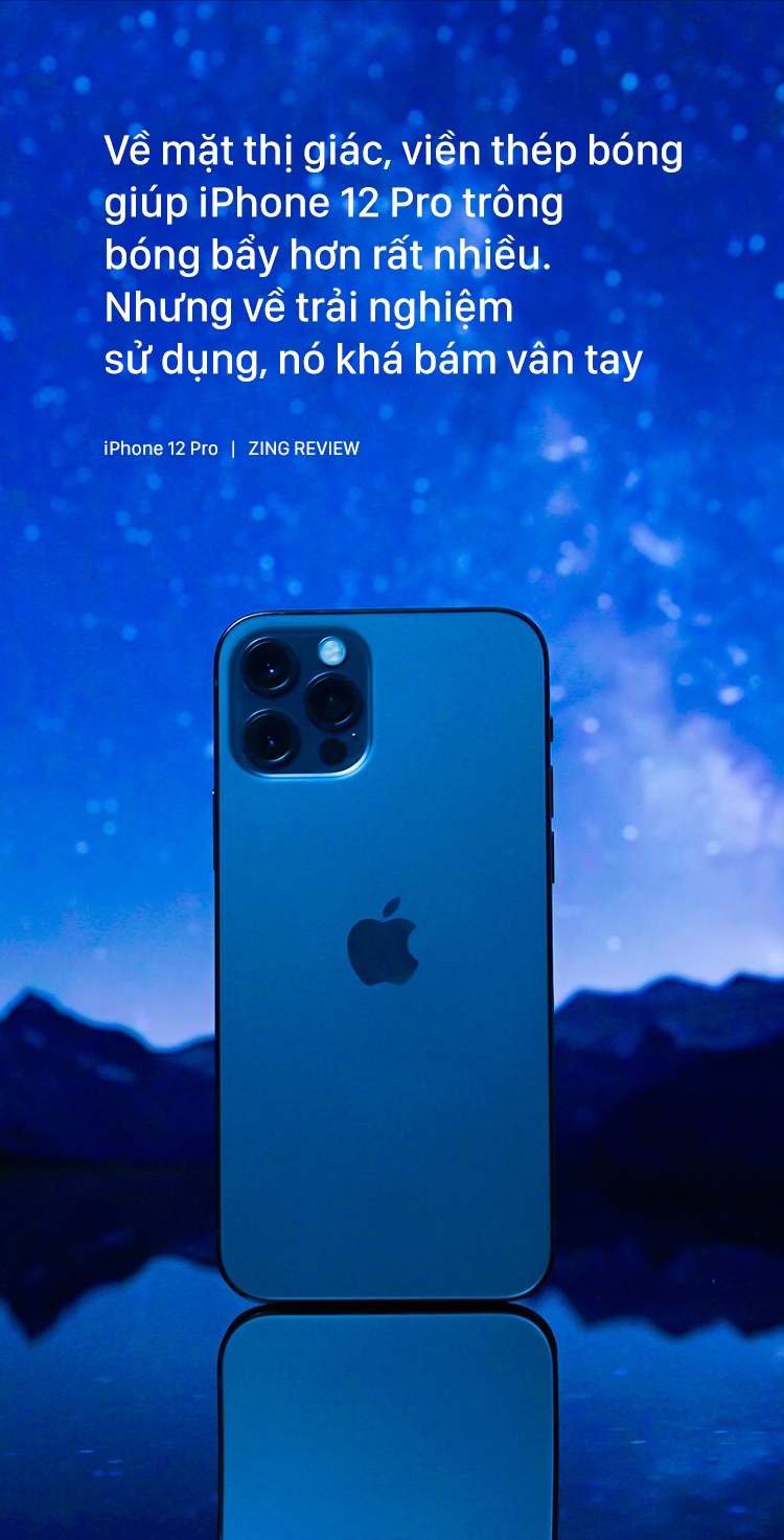 Tuy vậy, phần viền của máy lại được làm từ thép bóng. Về mặt thị giác, nó giúp iPhone 12 Pro trong bóng bẩy hơn rất nhiều. Nhưng về trải nghiệm sử dụng, nó khá bám vân tay. Với một người có đôi tay ẩm ướt như tôi, máy khá trơn, dễ rơi. Dù vậy, nó không phải vấn đề quá lớn bởi tôi đã quen với việc sử dụng ốp lưng.