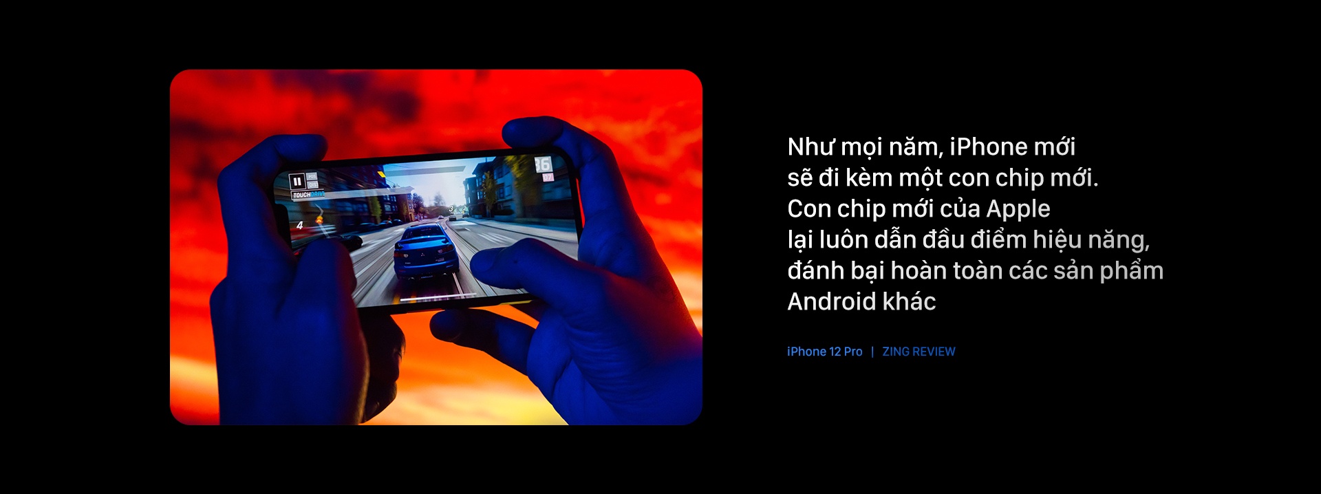 iPhone 12 Pro được trang bị bộ vi xử lý A14 Bionic giống như iPhone 12 và iPad Air. Thông lệ mọi năm, iPhone mới sẽ đi kèm một con chip mới. Con chip mới của Apple lại luôn dẫn đầu điểm hiệu năng, đánh bại hoàn toàn các sản phẩm Android khác.