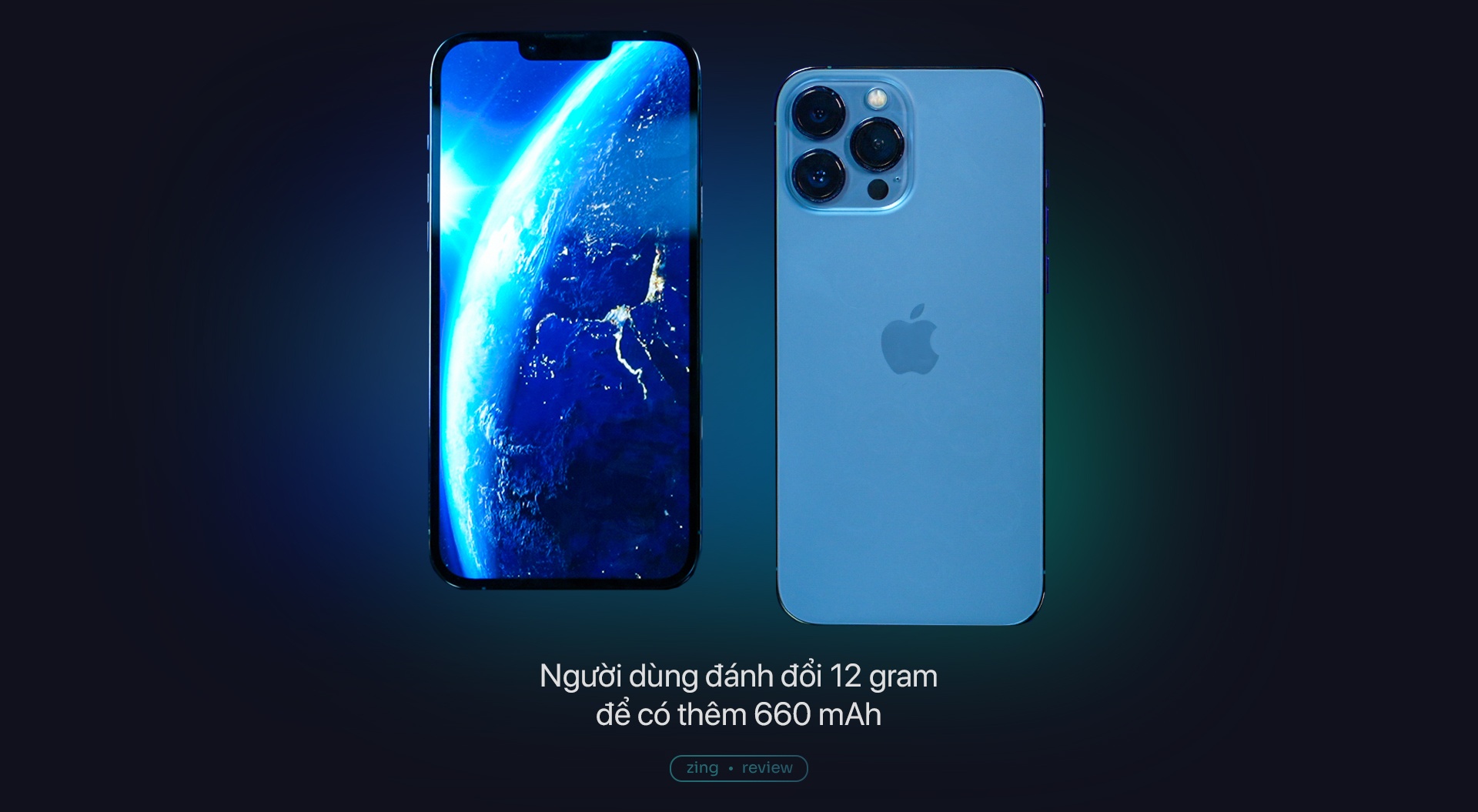 Nhiều người cho rằng pin của thế hệ iPhone 12 quá yếu, nhưng với tôi, iPhone 12 Pro Max vẫn đủ dùng. Dù vậy, Apple tiếp tục tăng thêm dung lượng pin cho iPhone 13 Pro Max, đây cũng là lý do chính khiến thiết bị dày và nặng hơn.