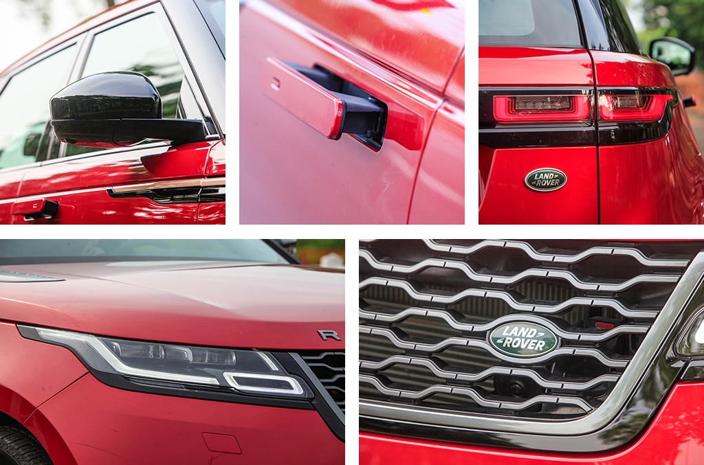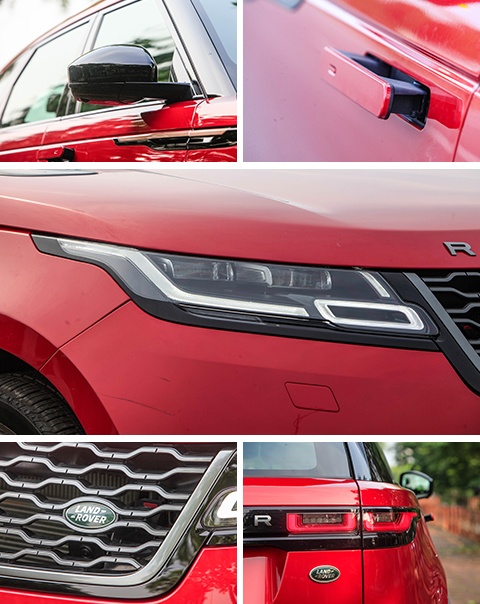 Điều đó đến từ khuôn hình tổng thể toát lên vẻ năng động với khoảng cách từ trục bánh trước đến mũi xe rất ngắn và khoảng cách từ trục bánh sau đến đuôi xe dài. Phần nóc xe bay với các trụ sơn đen, vuốt thoải về cốp như một mẫu SUV coupe. Ngoài ra, các điểm nhận diện như họa tiết trên cụm đèn LED trước/sau hay lưới tản nhiệt hình thang ngược vẫn hiện hữu ở chiếc Velar.