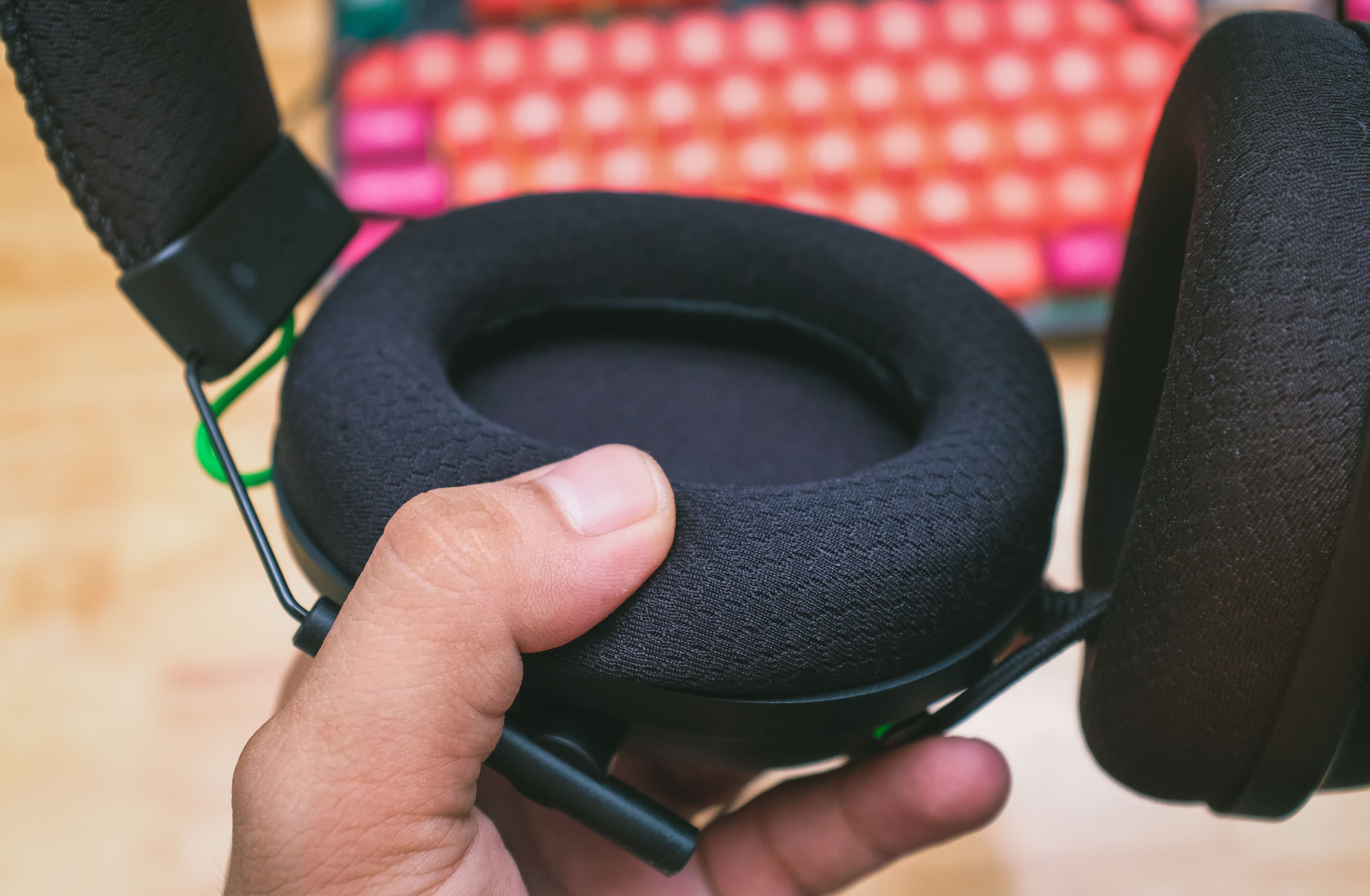 Ngoài ra, phần mút đệm bằng vải của Razer BlackShark V2 khá êm ái, khó bám bụi và thoáng khí. Những yếu tố kể trên giúp người dùng có thể đeo Razer BlackShark V2 nhiều hơn.