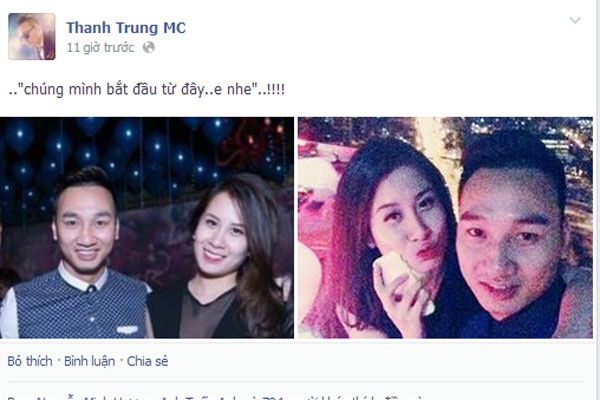 Tối qua, trang cá nhân của MC, danh hài Thành Trung thu hút sự chú ý khi chủ nhân đăng bức ảnh tình tứ bên một cô gái xinh đẹp kèm theo dòng chữ: “Chúng mình bắt đầu từ đây em nhé”. Trong ảnh, cô gái quàng tay qua cổ của Thành Trung, cả hai trông rất hạnh phúc. Nhiều bạn bè thân thiết đã chúc phúc cho cặp đôi.