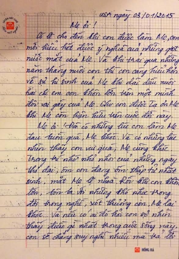 Vì tính chất đặc biệt của lá thư, nữ danh hài chuyên mang đến niềm vui cho bao người khác đã quyết định chia sẻ nó lên trang cá nhân. Cô bày tỏ trên facebook: “Lâu lắm, mười năm hơn rồi mới viết thư cho mẹ. Lúc bé sở thích của mình là thích viết thư. Tuy hai mẹ con ở trong một căn nhà nhỏ có chuyện gì mình không dám nói hay không dám xin thì lại viết một lá thư bỏ dưới gối nằm của mẹ. Khi nào mẹ biết lấy ra đọc thì mình bỏ trốn vì mắc cỡ... nhưng thường mẹ đọc xong thường khóc và yêu mình hơn. Hôm nay, mình lại viết một lá thư gửi mẹ nhưng gửi từ xa lắm, gửi từ Mỹ về Việt Nam cho mẹ. Thời buổi này, công nghệ hiện đại tràn ngập: điện thoại, internet, face time… có thể nói với mẹ trực tiếp nhưng mình vẫn yêu cái cảm xúc thư viết tay vì đây là cảm xúc mình viết từ trong tâm, từ trong con tim, từ trong đáy lòng không dám nói thẳng với mẹ... và cảm xúc mình viết bằng nước mắt!”.