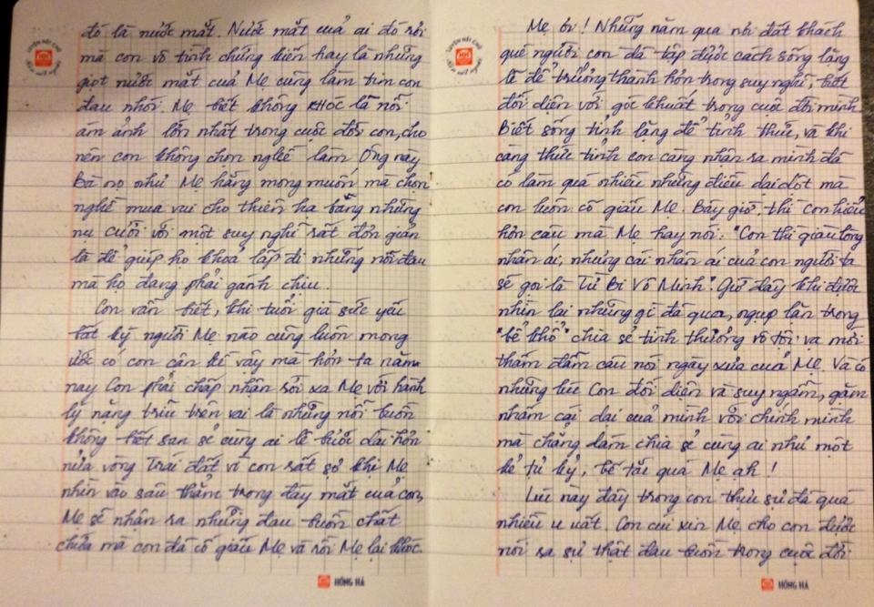Và nếu có ai đó hỏi con sợ nhìn thấy gì nhất trong cuộc sống này, con sẽ chẳng suy nghĩ nhiều mà trả lời đó là nước mắt. Nước mắt của ai đó rơi mà con vô tình chứng kiến hay là nước mắt của mẹ cũng làm tim con đau nhói. Mẹ biết không, khóc là nỗi ám ảnh lớn nhất trong cuộc đời con cho nên con không chọn nghề làm ông này bà nọ như mẹ hằng mong muốn mà chọn nghề mua vui cho thiên hạ bằng những nụ cười với một suy nghĩ rất đơn giản là giúp họ khỏa lấp đi những nỗi đau mà họ đang phải gánh chịu. Con vẫn biết, khi tuổi già sức yếu bất kỳ người mẹ nào cũng mong ước con cận kề vậy mà hơn ba năm nay con lại phải chấp nhận rời xa mẹ với hành lý trên vai là những nỗi buồn không biết san sẻ cùng ai, lê bước dài hơn nửa vòng trái đất vì con rất sợ khi mẹ nhìn vào sâu thẳm trong đáy mắt của con mẹ sẽ nhận ra những đau buồn chất chứa mà con đã cố giấu mẹ và rồi mẹ lại khóc...".