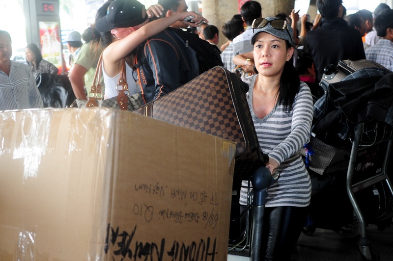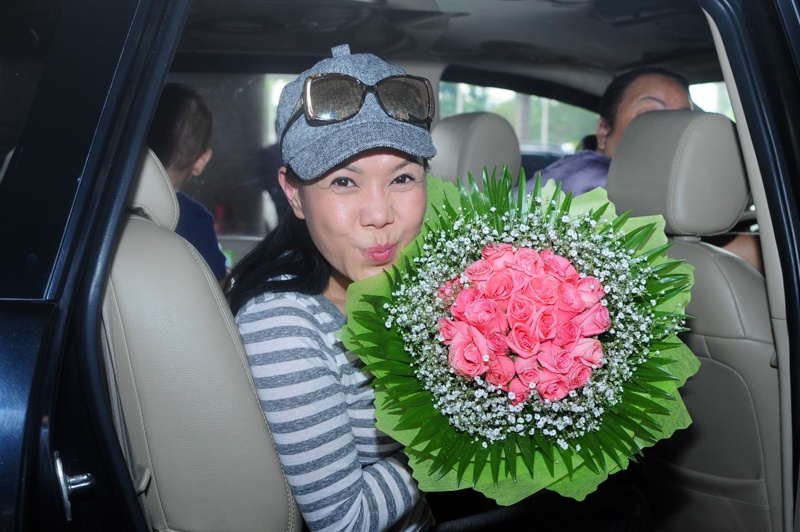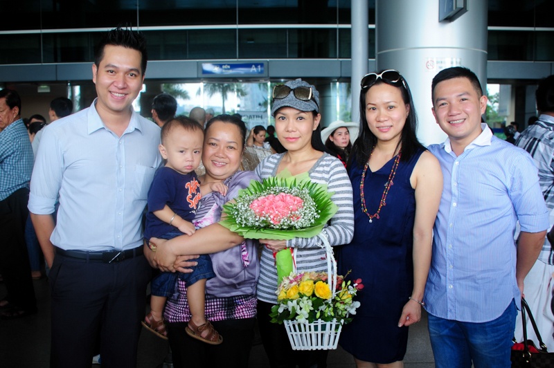 | Việt Hương đi cùng chị gái. Các thành viên khách trong gia đình cũng ra tận sân bay đón chị cùng MC Anh Khoa. |
