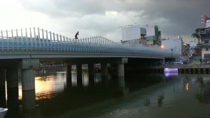 | Chàng trai nhảy từ Cầu Kiệu xuống kênh Nhiêu Lộc. Ảnh: Phong Tran. |