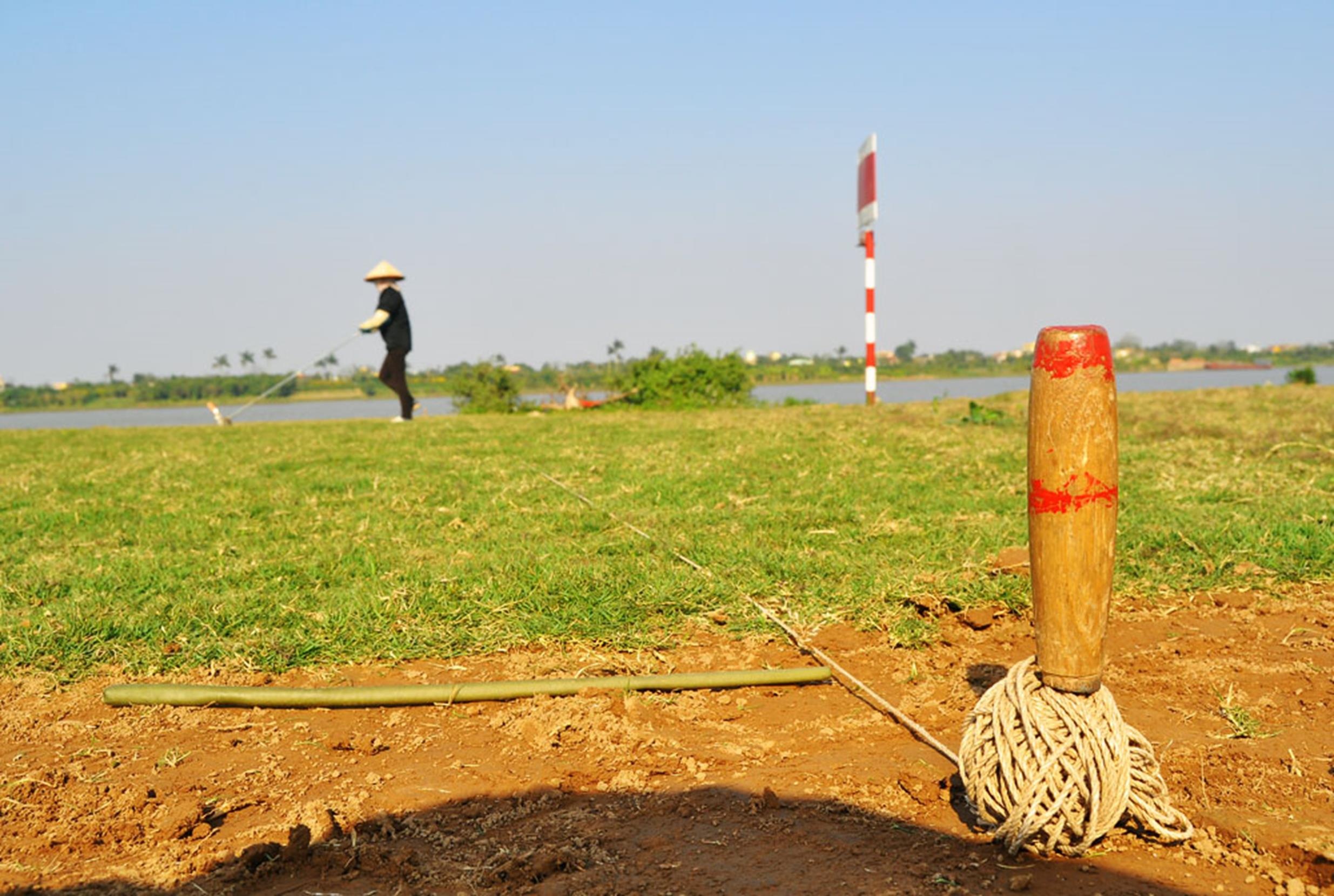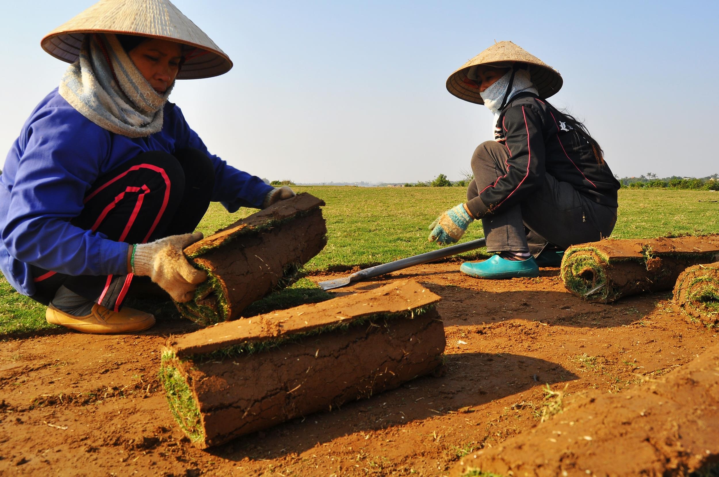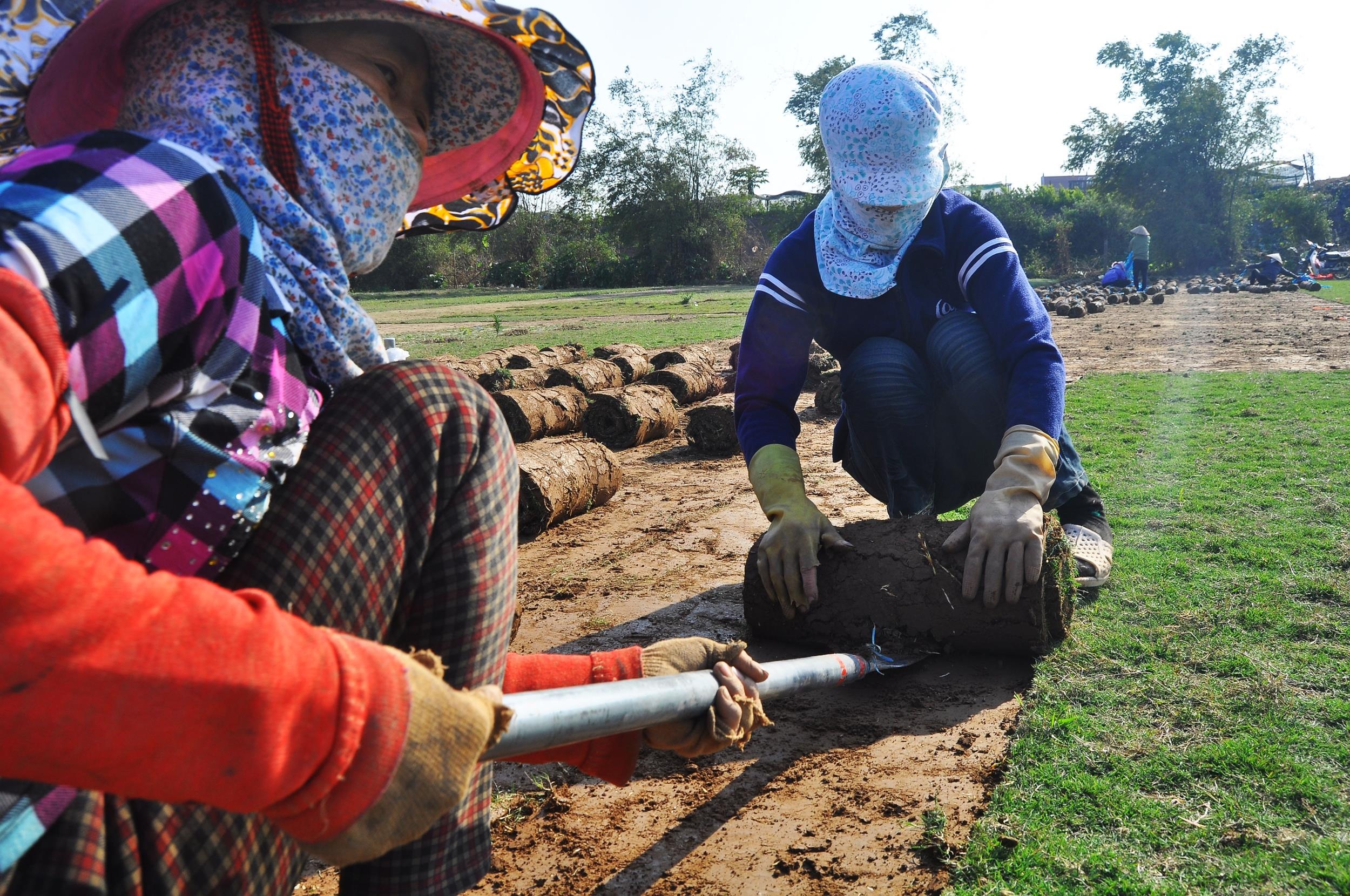 | Cỏ được dao cắt thành tấm cỡ 40x100cm, sau đó hai người dùng thuổng xấn gọn từng tấm một. |