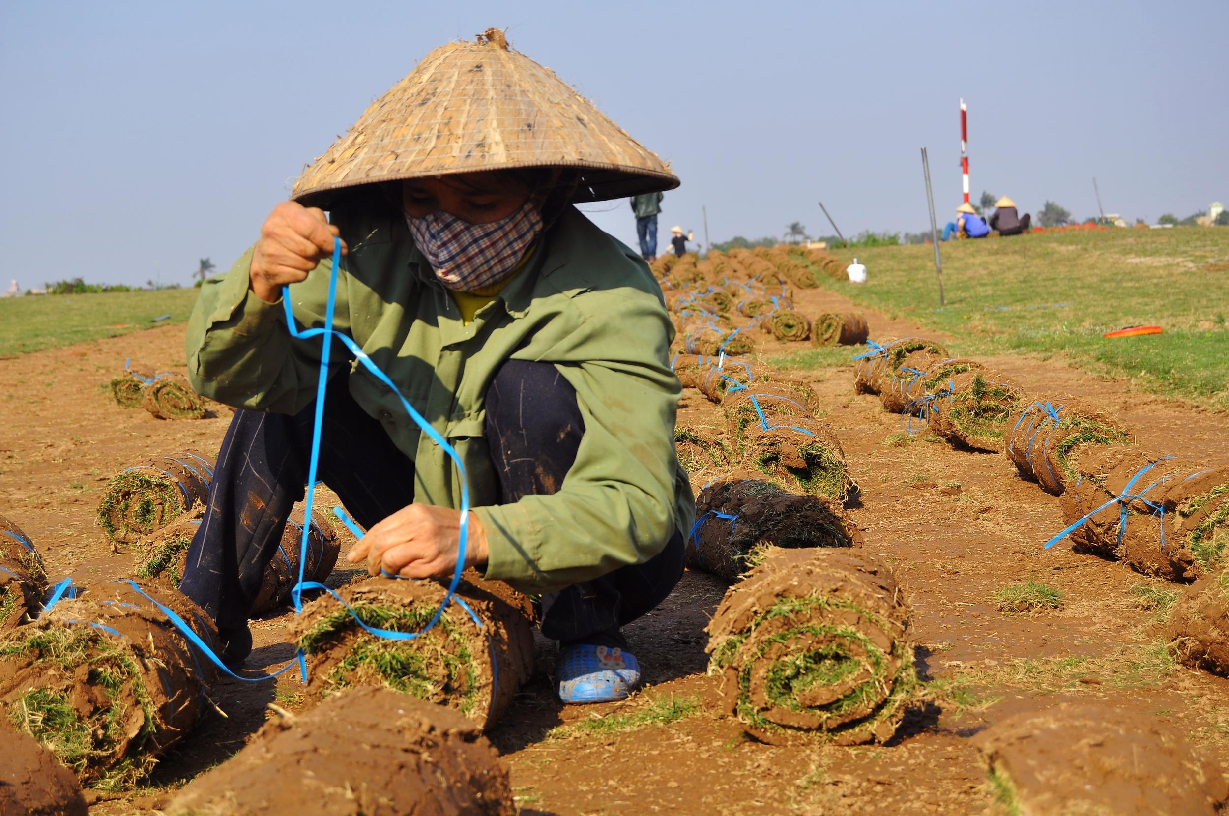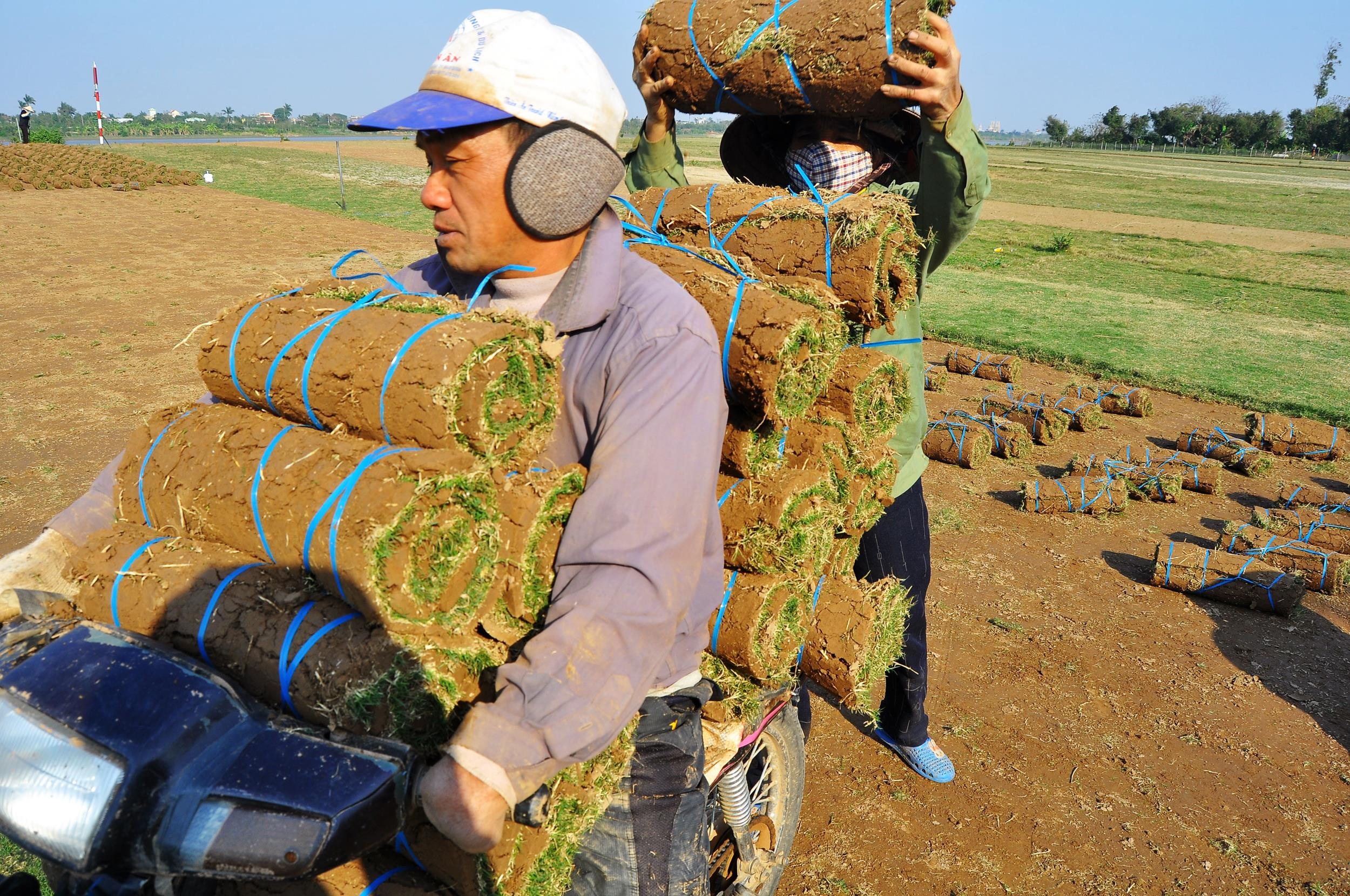 | Họ dùng dây buộc gọn các tấm thảm cỏ để vận chuyện đường dài. |