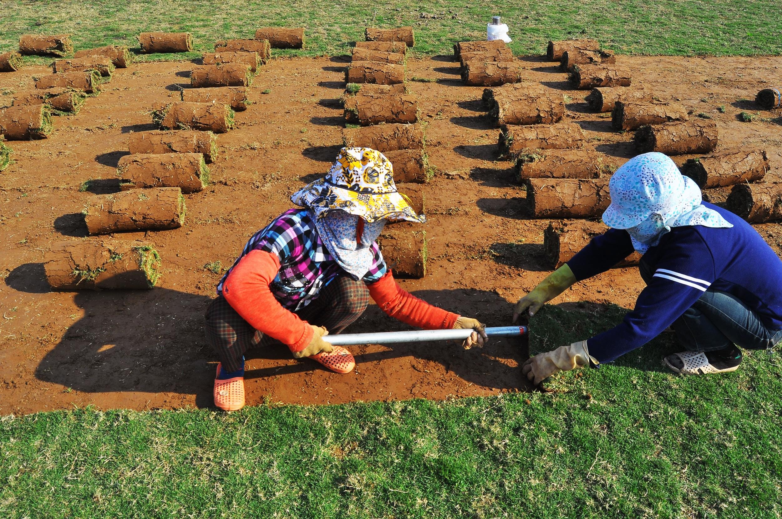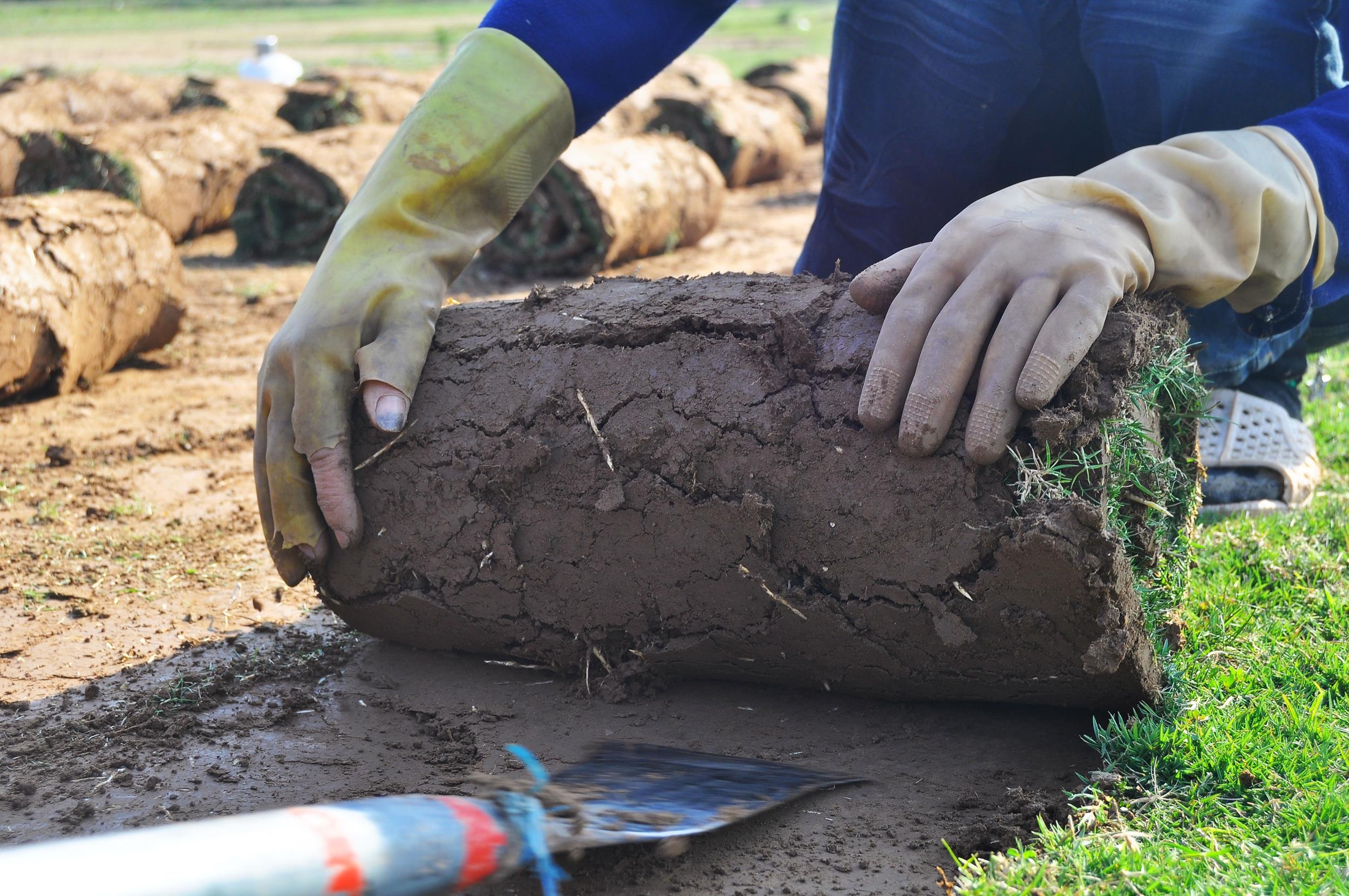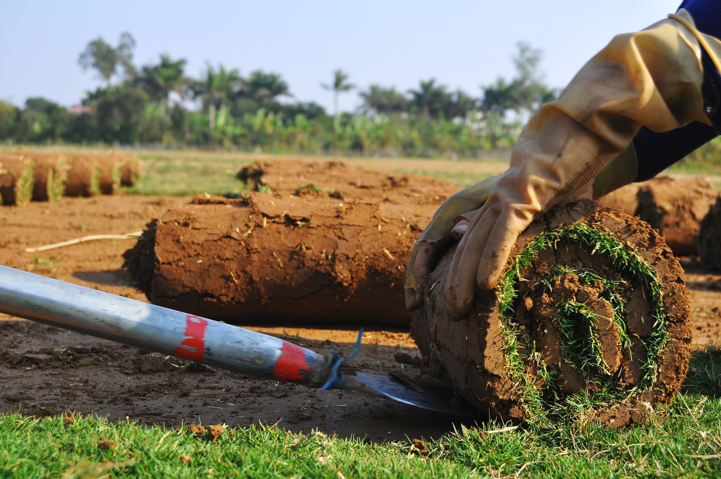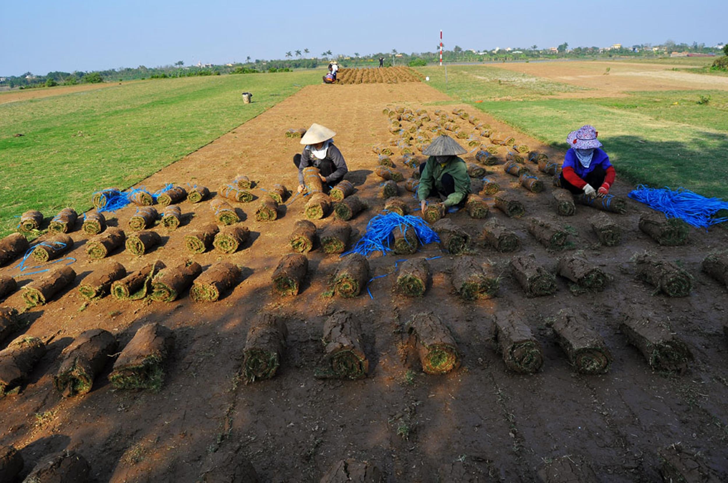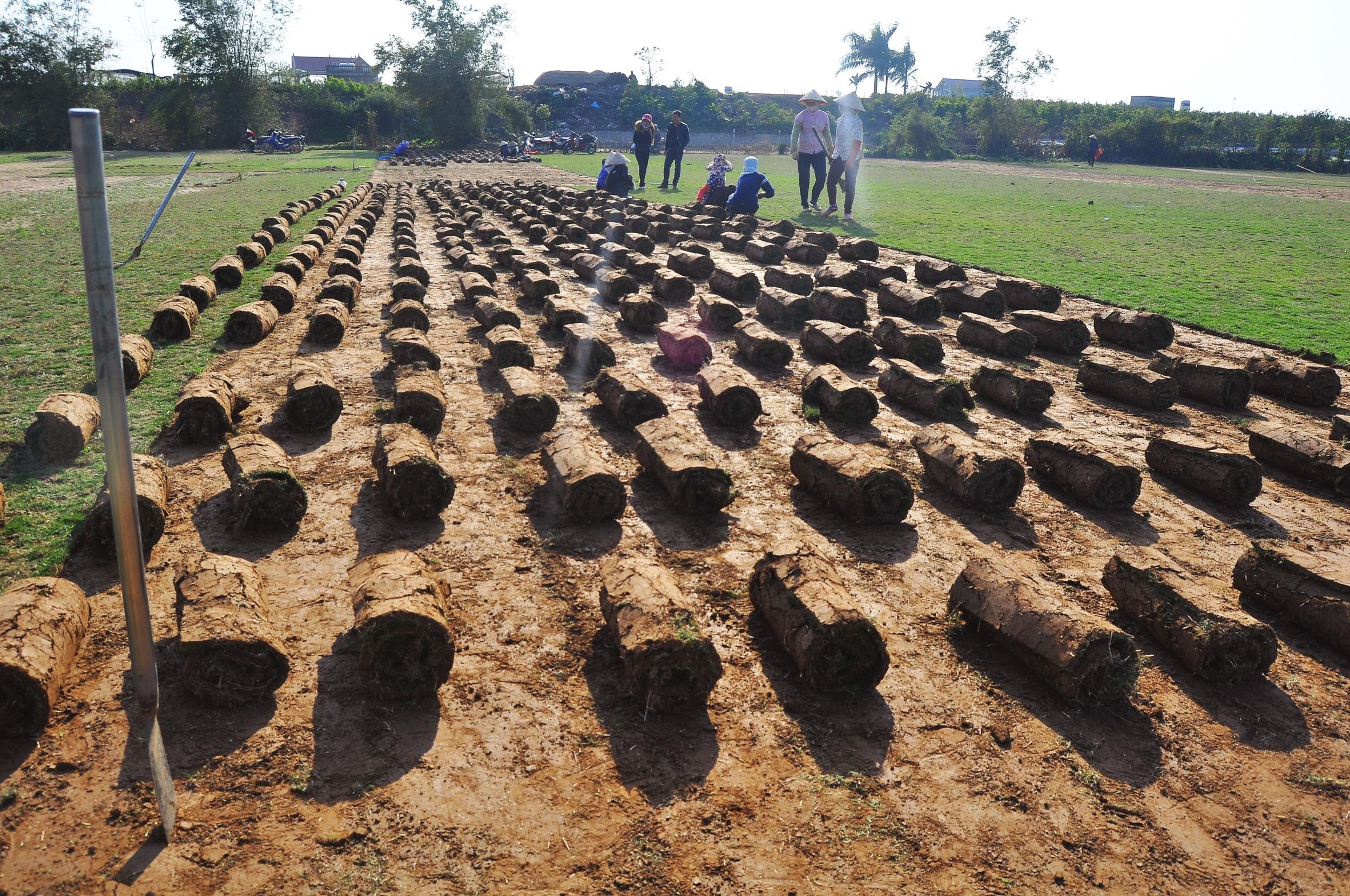 | Những tấm thảm cỏ được cuộn tròn và xếp thành hàng lối gọn gàng. |