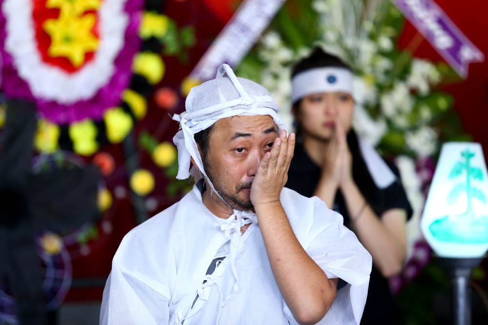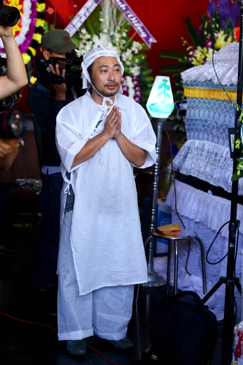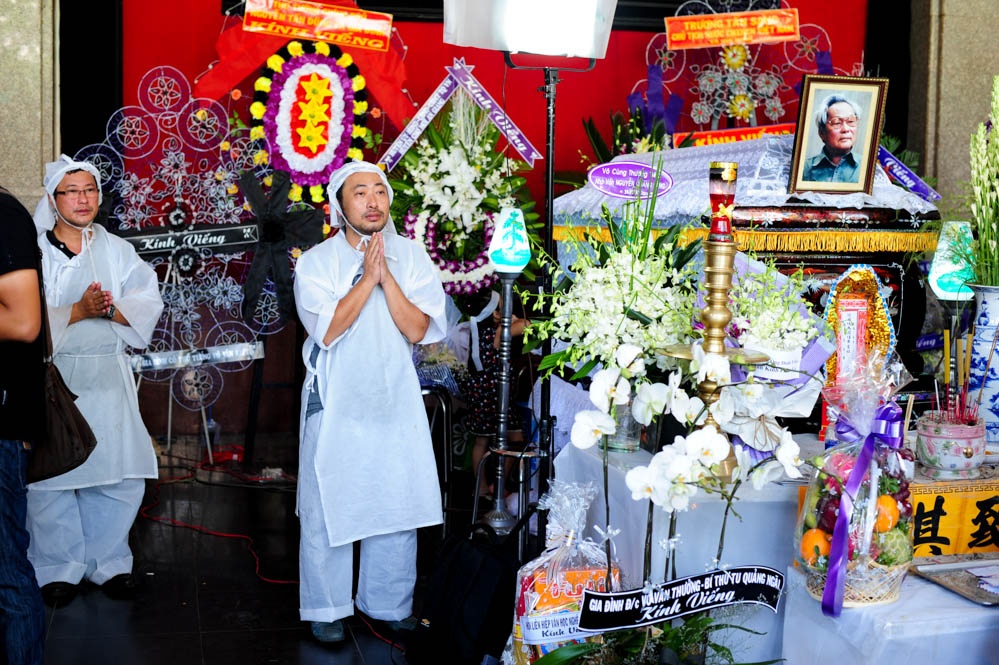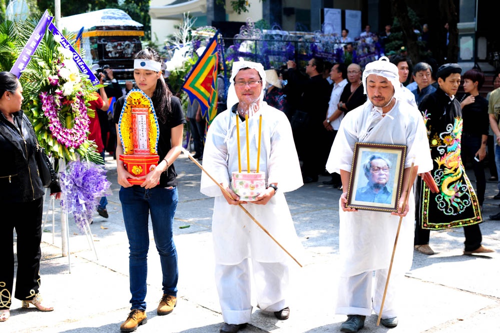| Anh trai đạo diễn bưng bát hương, Quang Dũng ôm di ảnh của cha trong lễ di quan. |