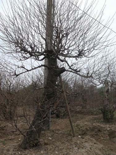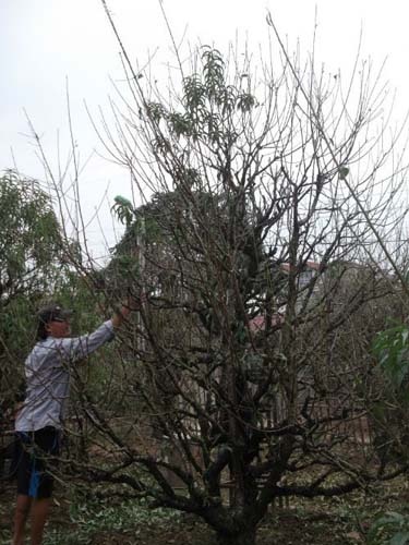 | Ông Chu Đức Toản đang tuốt lá cho cây đào 20 năm của mình. |