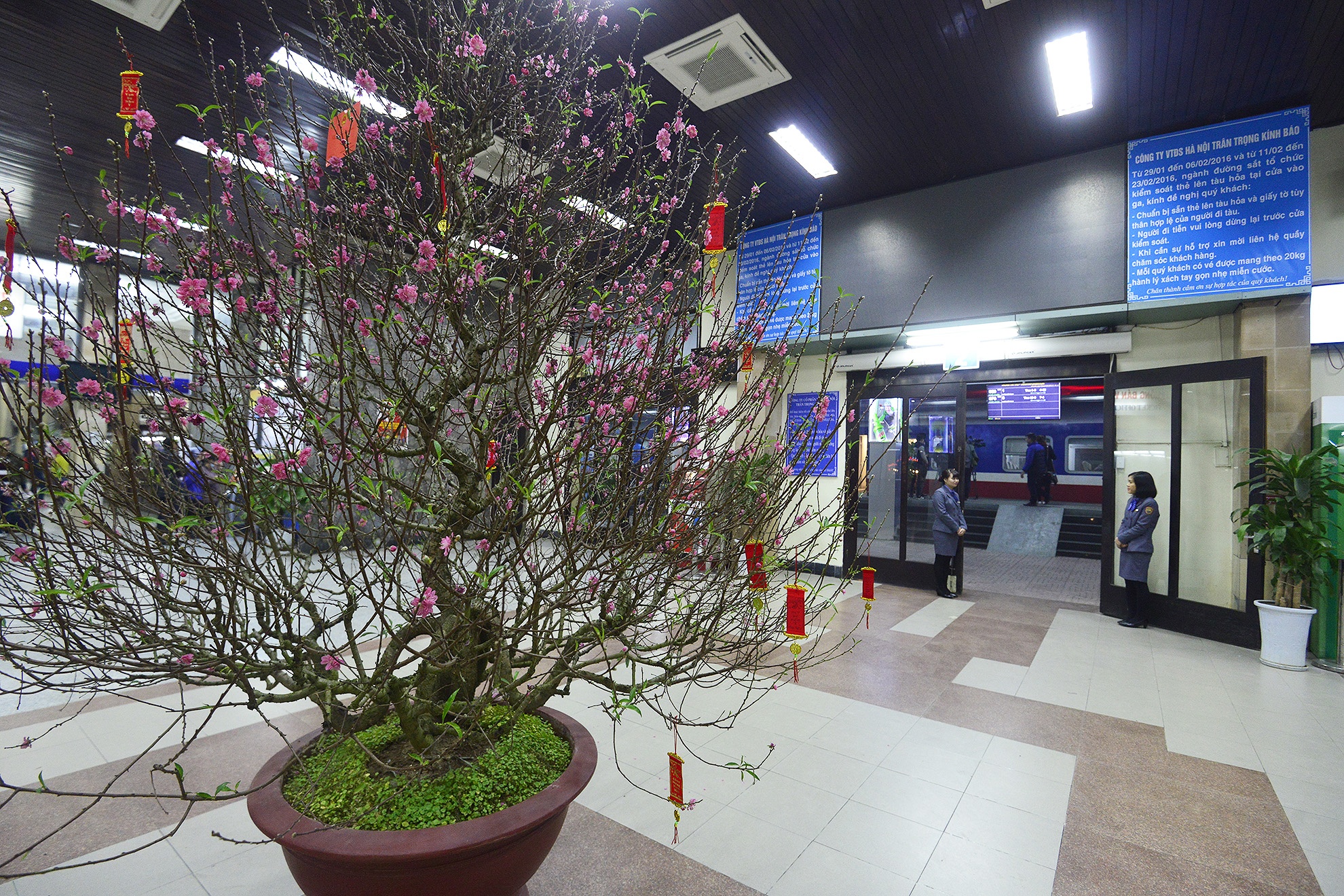 Trên chuyến tàu cuối cùng của năm Ất Mùi ở ga Hà Nội, nhiều người dân các tỉnh phía Nam mang cành đào đỏ thắm về quê đón Tết sum vầy cùng gia đình.
