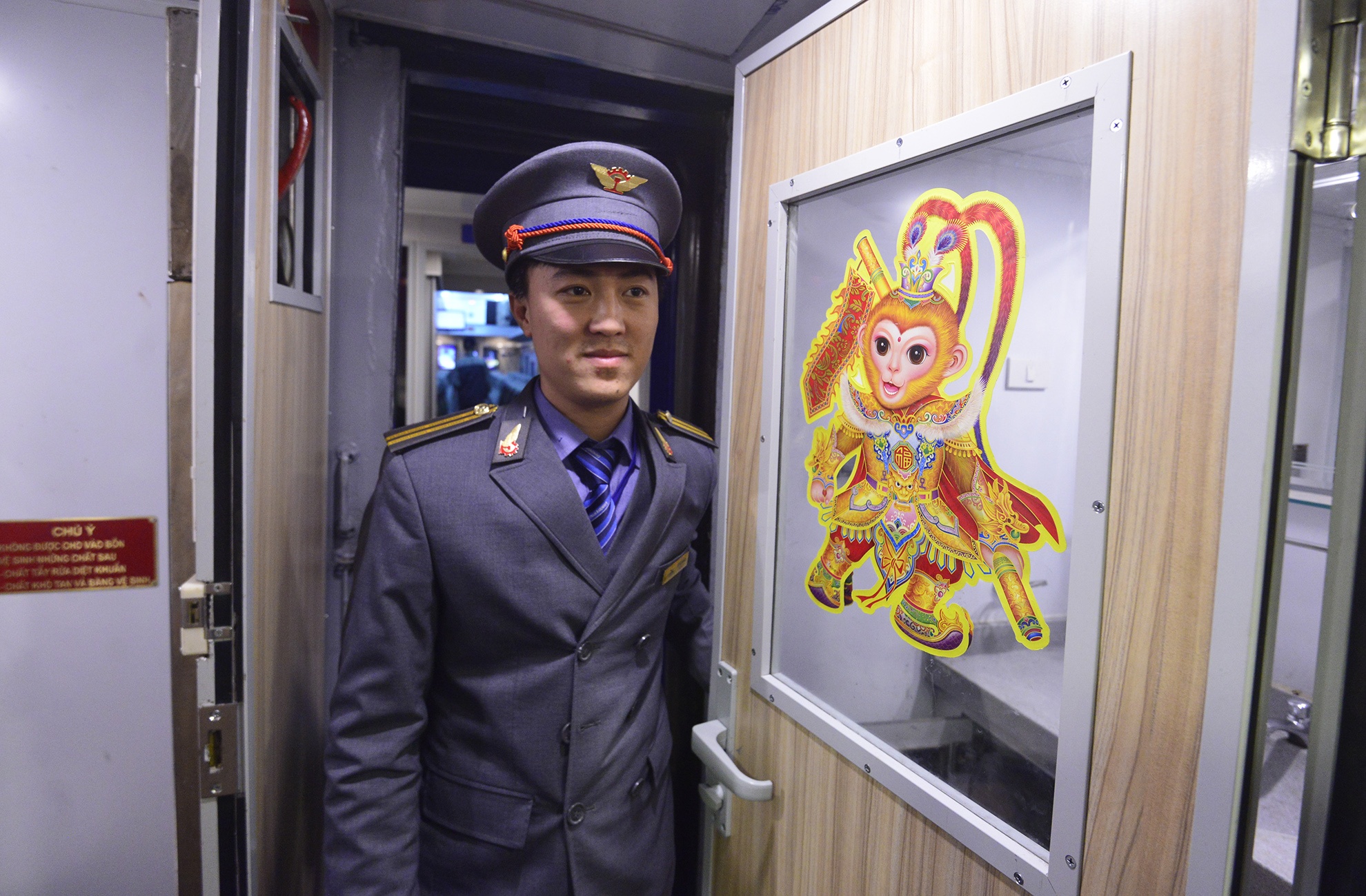 | Nhân viên tiếp tân toa ghế ngồi kết thúc khâu trang trí đoàn tàu đón Tết Bính Thân 2016. |