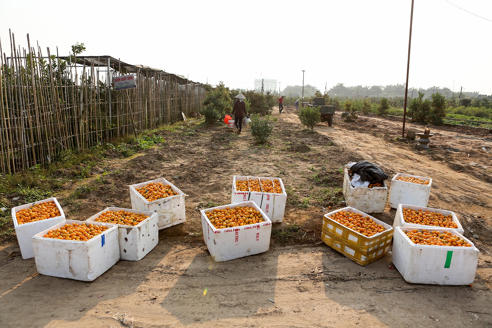 | Quất sai trĩu quả nhưng không bán được, chủ vườn cho mọi người tự do hái. Gia đình chị Lan gồm 8 người (quê ở Văn Giang, Hưng Yên), cứ sau Tết lại lên Hà Nội thu hoạch quất về bán cho hộ làm mứt. Mỗi kg quất này có giá 1.000 đồng. |