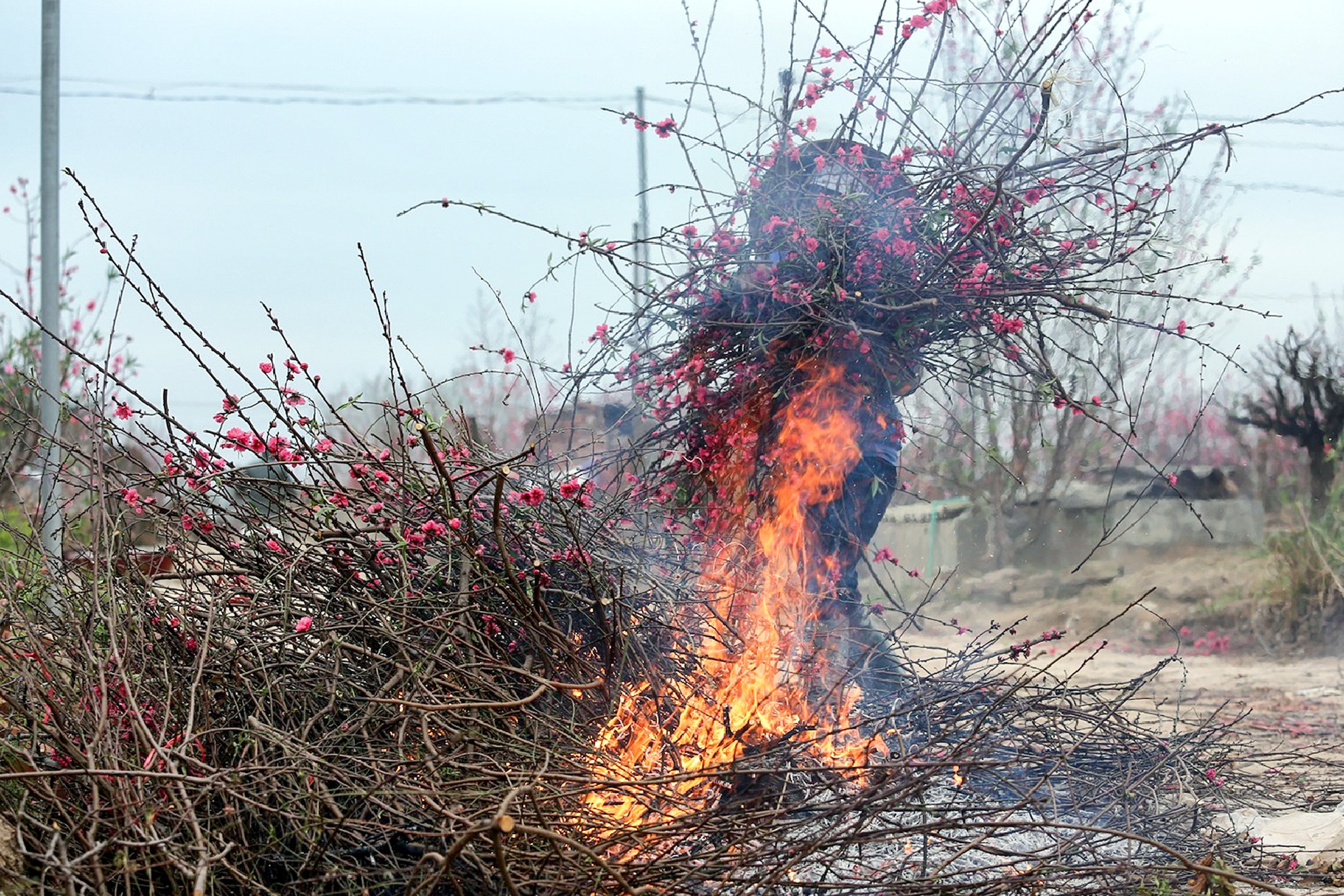 Hết Tết đào vẫn đẹp, chị Lan tiếc nên đang tranh thủ cắt đi bán gỡ lại sức lao động cho cả năm vất vả. "Cả xe đào này bán đi chắc cũng chỉ mua được con gà cúng rằm thôi", chị nói. |