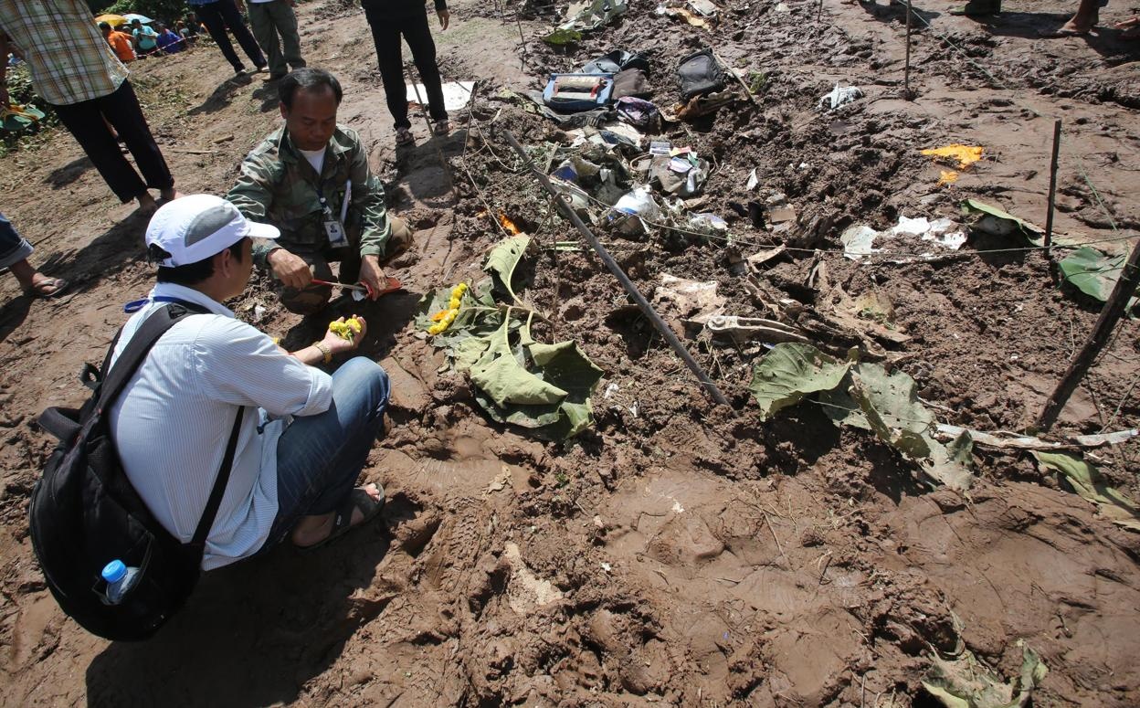 | Người dân, binh sĩ, cảnh sát vây quanh những tài sản của hành khách trên máy bay ATR 72 của Lao Airlines. Ảnh: Ảnh: Reuters. |