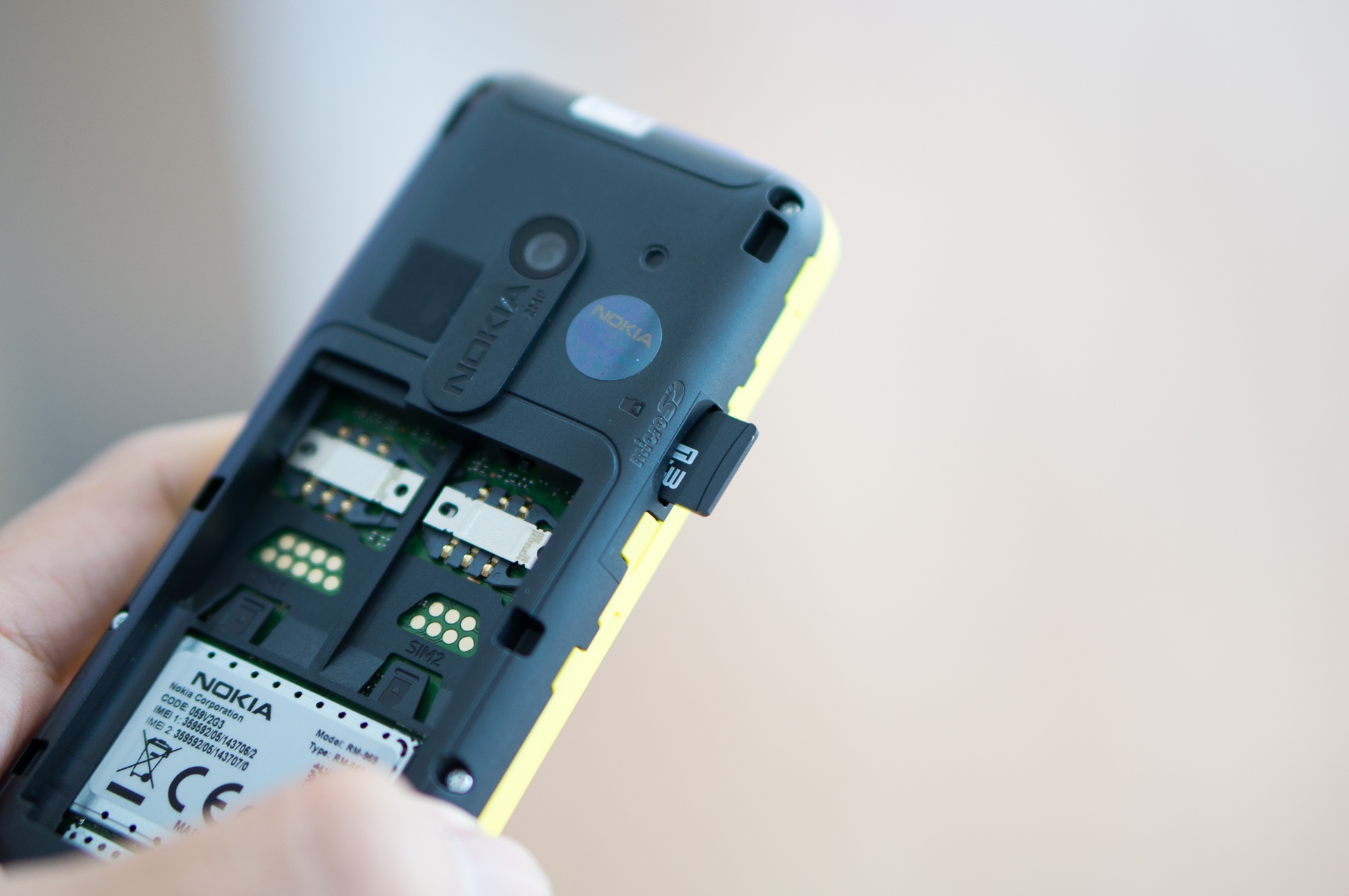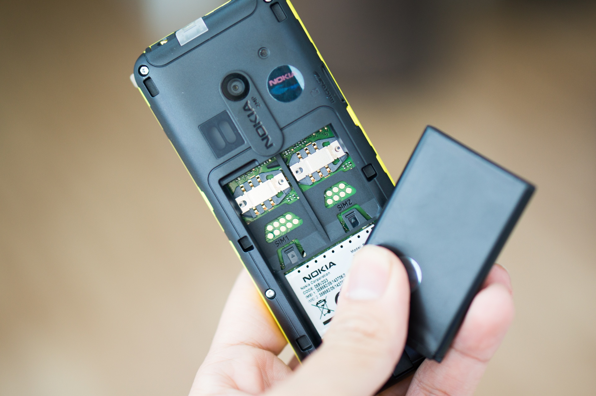 | Hai khe SIM nằm ở dưới pin. |