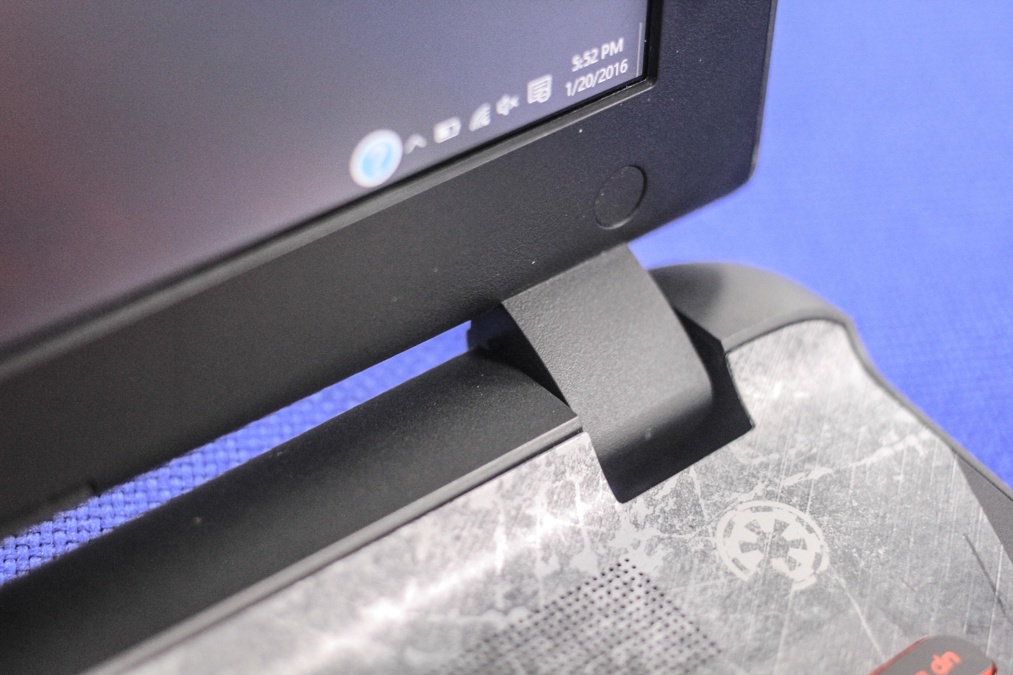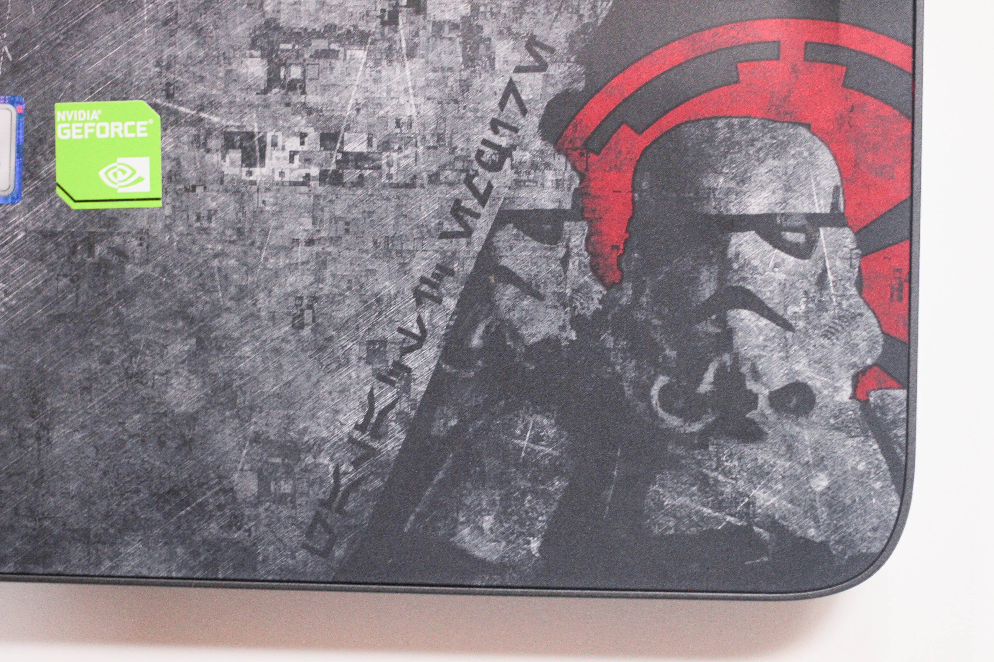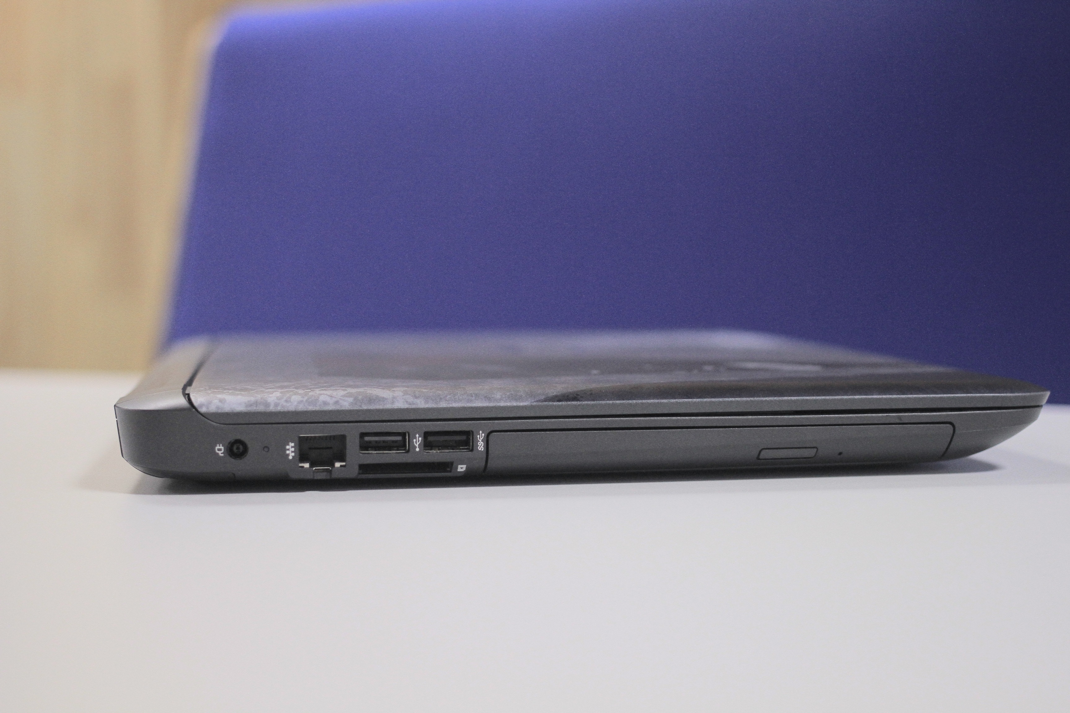 Thân máy khá dày, với kích thước 2,52 cm. Cạnh trái là cổng sạc, kết nối mạng LAN, 2 cổng USB 3.0 và khe cắm thẻ nhớ. HP Star Wars cũng được trang bị cả ổ quang DVD-RW.