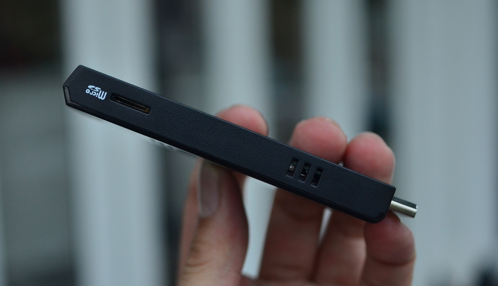 | Intel Compute Stick có kích thước dài 103 và ngang 37 mm. Các cổng giao tiếp, kết nối được đặt ở cạnh bên. |