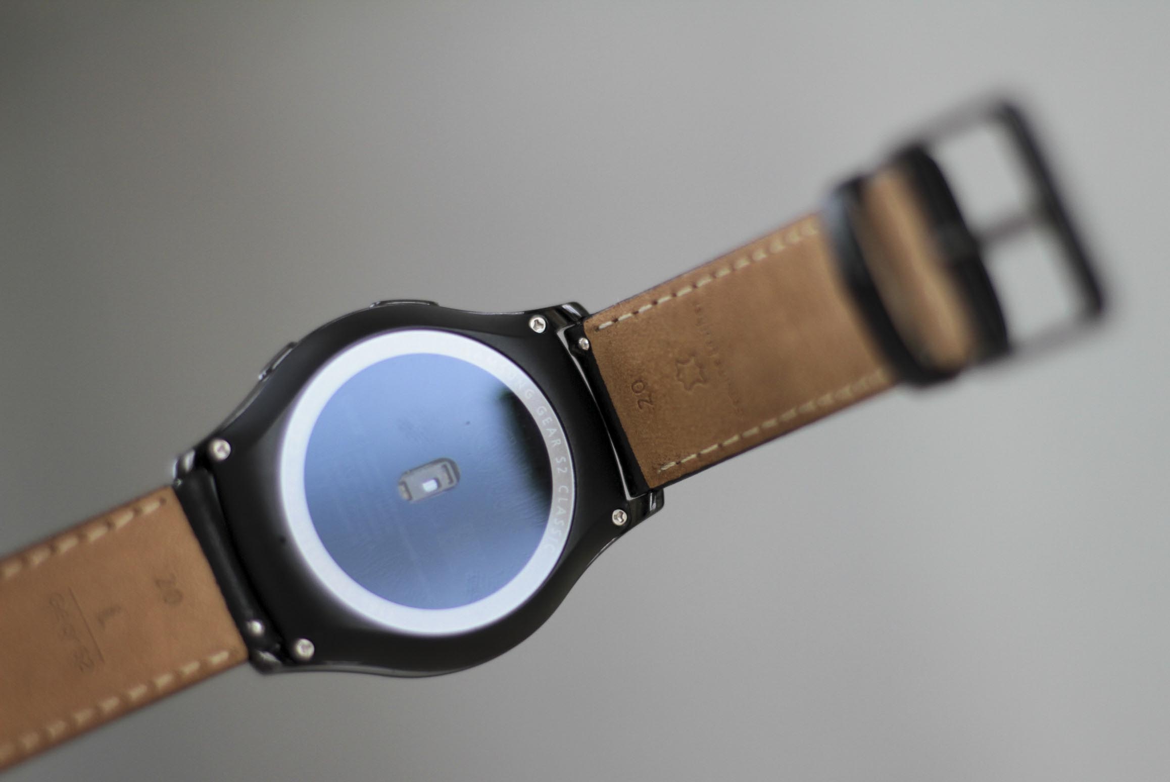 | Mặt sau là cảm biến đo nhịp tim, đây cũng là vị trí để đổng hồ kết nối với sạc không dây. Mặt lưng này làm bằng kính và dễ bám mồ hôi. |