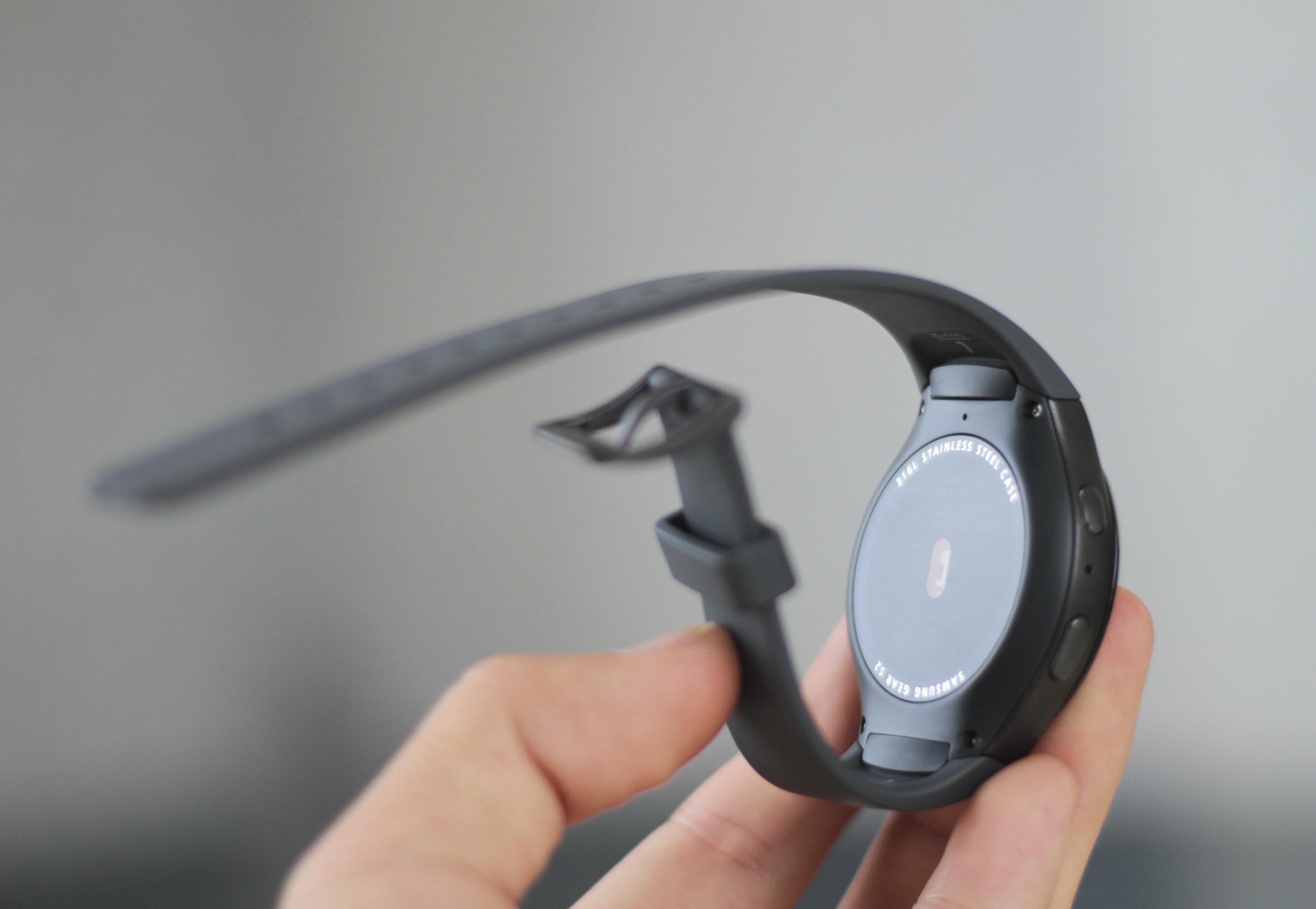 | Đây đeo của bản Sport được làm bằng cao su mềm, nó ôm tay và cho cảm giác khá thỏa mái, không bị cấn. Người dùng cũng có thể thay đổi những màu dây khác nhau do Samsung sản xuất. |