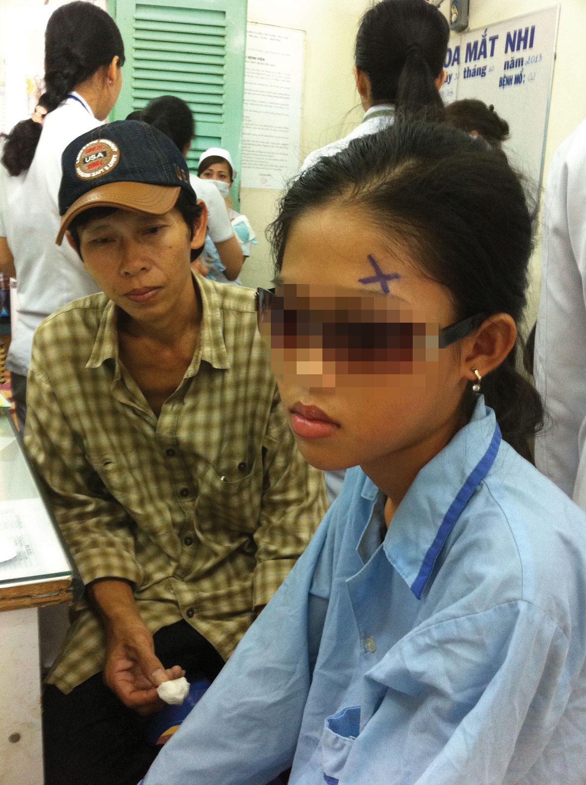 Bé T.M cũng rơi nước mắt nhớ lại buổi tối ngày 10/10, mẹ của bé đã lấy hơn 10 lá dâm bụt, giã nhuyễn và đắp lên 2 mắt cho con gái. Chừng nửa tiếng sau, “con thấy mắt đau đau nên nói mẹ. Mẹ bảo “chắc không có gì đâu, do con bị đau mắt nên mới có cảm giác vậy” và mẹ lấy lá dâm bụt ra rồi lau sơ hai mắt. Con đi ngủ đến gần sáng thì thấy càng lúc mắt càng nhức, rồi chuyển qua đau đầu. Lúc này ba mẹ đưa con đi TP.HCM nhập viện luôn”.