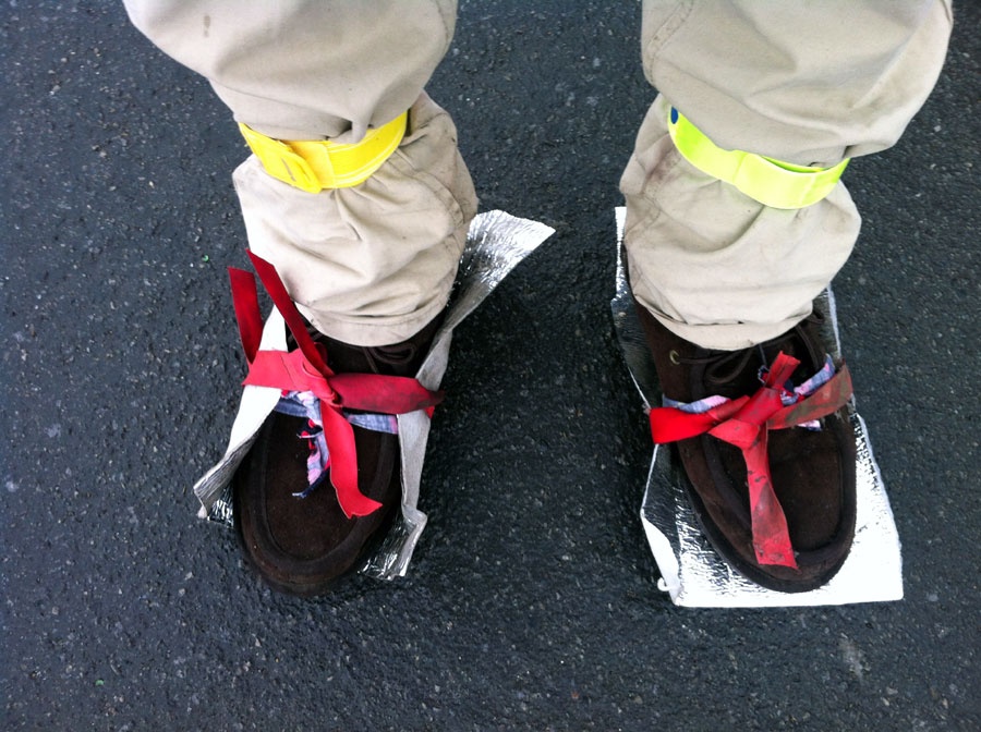 Thời tiết mùa đông ở Trung Quốc rất khắc nghiệt. Cả đoàn phải tìm cách bảo hộ đôi chân. Ảnh: CRI.