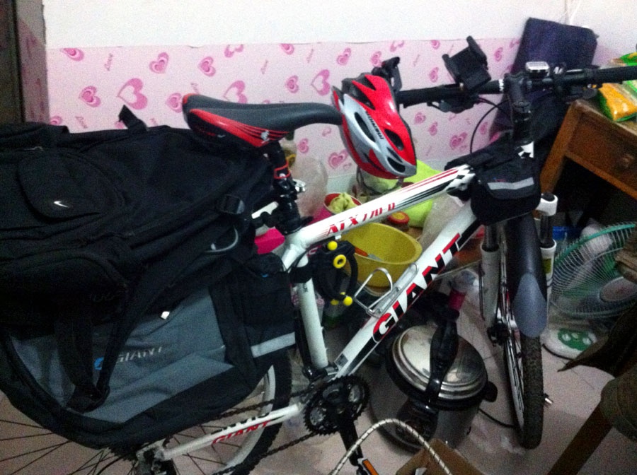 Anh chuẩn bị cho chuyến đi khá đơn giản, chỉ với một chiếc mũ bảo hiểm, bơm xe, dầu nhờn, dụng cụ sửa xe, một lốp dự phòng và bản đồ. Ảnh: CRI.