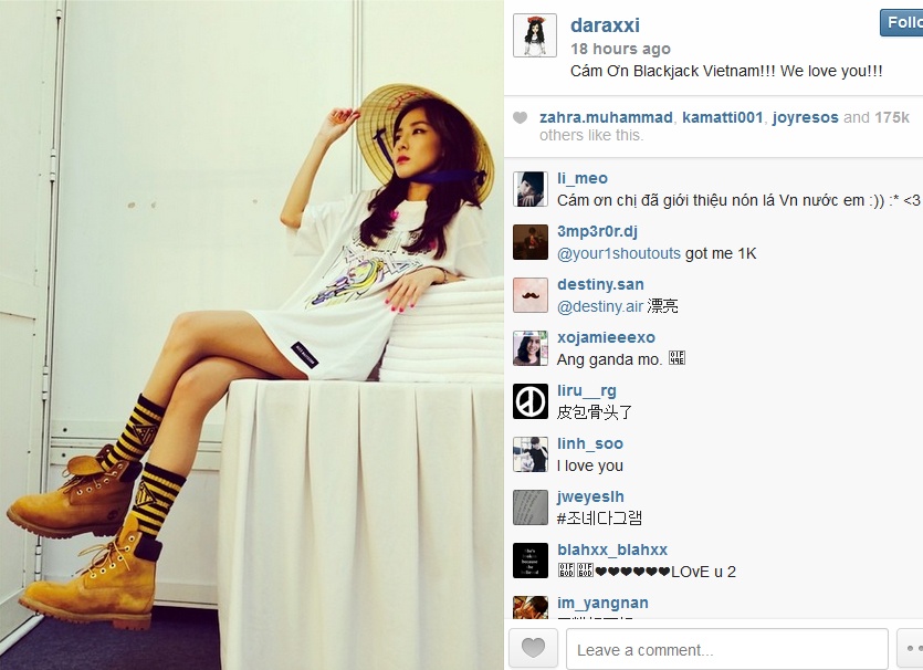 | Tối 10/8, ngay khi show diễn kết thúc, Dara cũng đã đăng lên blog hình ảnh cô chụp chung với chiếc nón lá cùng lời cảm ơn fan Việt được viết chính xác bằng tiếng Việt. |