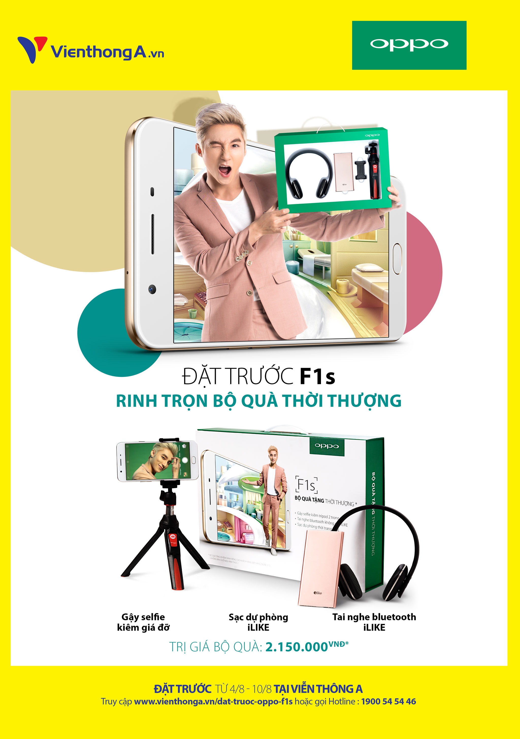 Thấu hiểu được nỗi lo về chi phí để trang bị phụ kiện mỗi khi mua máy mới, Viễn Thông A đã phối hợp cùng OPPO ra mắt chương trình khuyến mãi lớn dành cho các tín đồ công nghệ. Cụ thể, từ 4/8 đến 10/8, khi đặt trước sản phẩm OPPO F1s tại hệ thống siêu thị Viễn Thông A và trả trước 500.000 đồng (giá máy 5,99 triệu đồng) khách hàng sẽ sở hữu ngay bộ quà tặng công nghệ trị giá tới 2,15 triệu đồng.