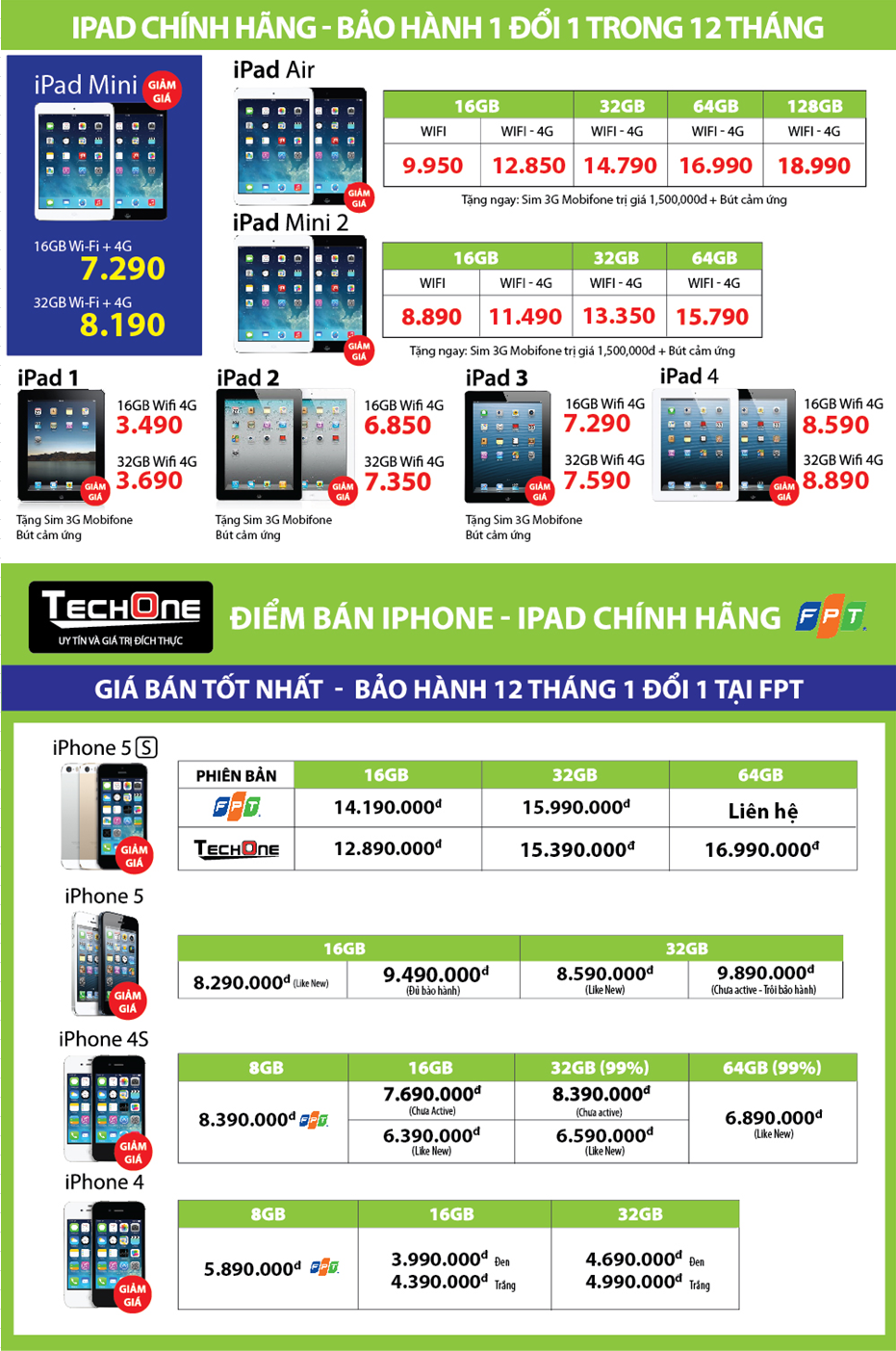 - iPad mini 2 16GB 4 G: 11,4 triệu đồng (Giá NY: 12,4 triệu đồng) khuyến mại trị giá 1,6 triệu đồng.