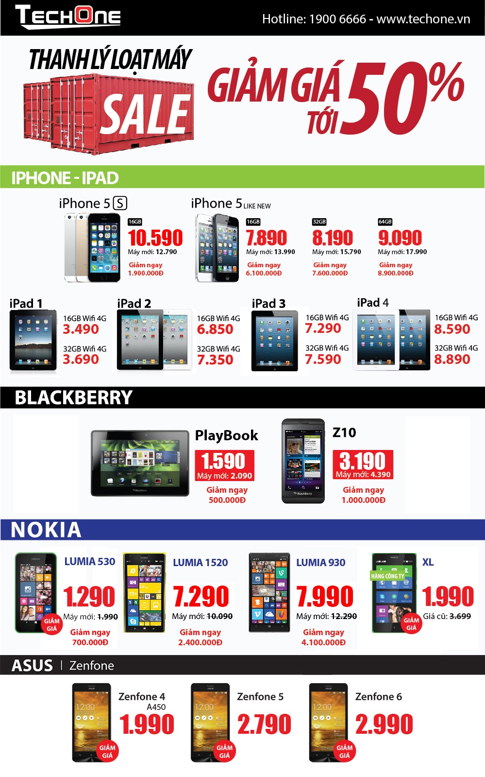 Hưởng ứng tháng khuyến mại của Bộ công thương, TechOne triển khai xả kho 500 máy điện thoại HOT: iPhone 6/5/5s, BlackBerry Q10,Sony Z3,Nokia 1320, Nokia X với giá bán thấp hơn giá nhập.Gần 500 model máy điện thoại vừa túi tiền với giá bán thấp hơn giá nhập. Sản phẩm mua không hạn chế số lượng. Giá bán, khuyến mại, chất lượng sản phẩm và dịch vụ hậu mãi không thay đổi. Hãy đến với TechOne để được là một trong 500 khách hàng may mắn.