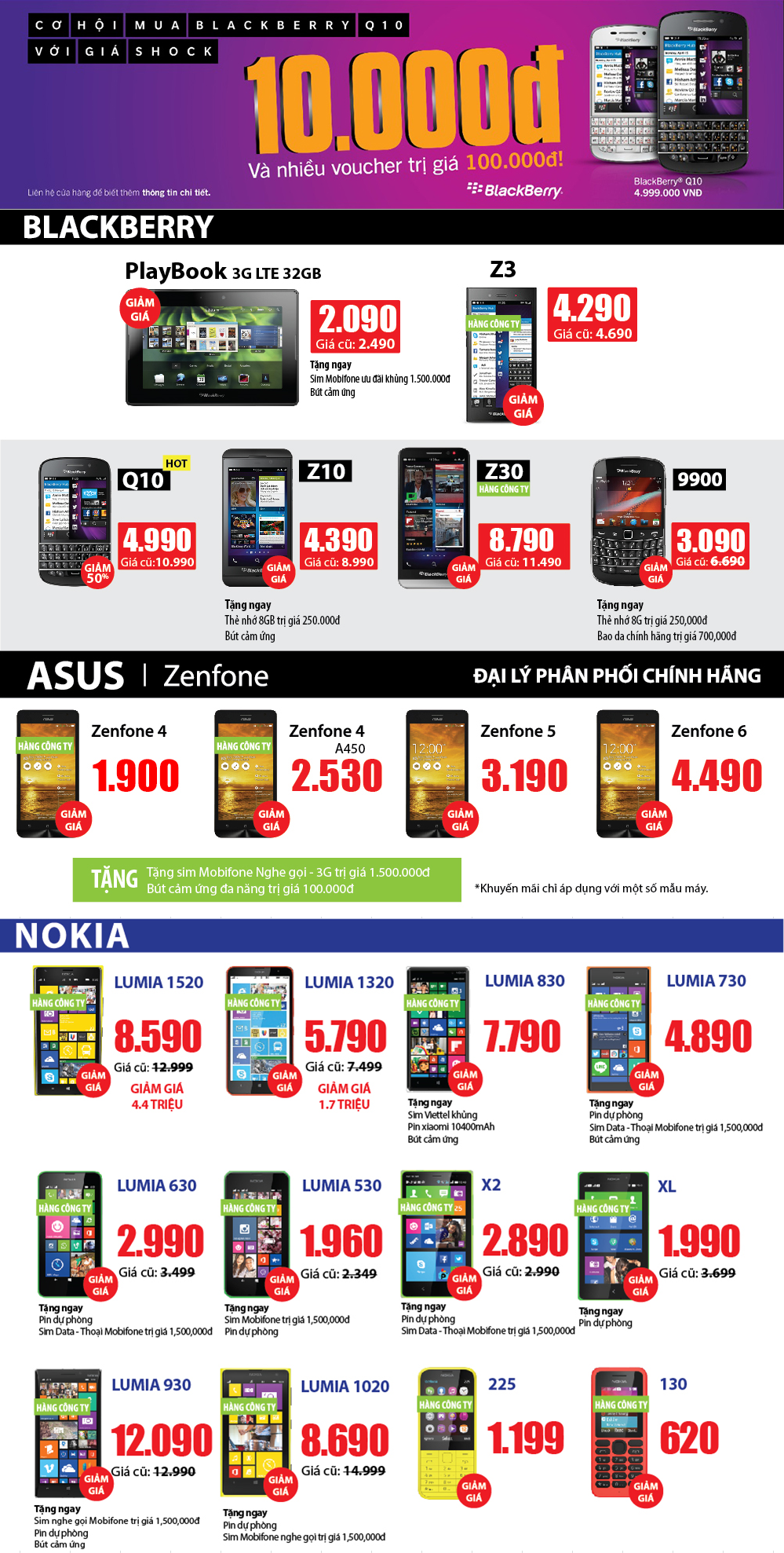 - Q10 công ty: 4,99 triệu đồng (Giá cũ: 5,49 triệu đồng), tiết kiệm 500.000 đồng và nhận phiếu bốc thăm cơ hội mua BlackBerry Q10 với giá chỉ 10.000 đồng