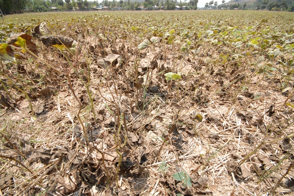 | Cánh đồng ở vùng Bảy Núi bị khô cháy, hoa màu chết rụi. |
