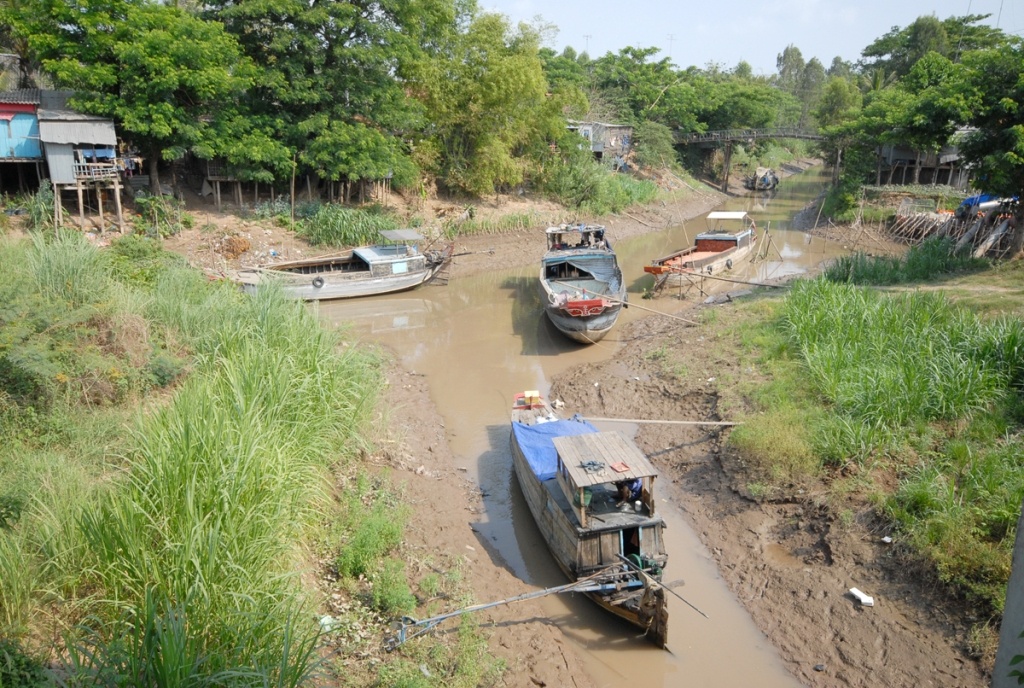 | Các con kênh ở huyện Tri Tôn khô cạn khiến ghe tàu phải nằm đợi nước lớn. |