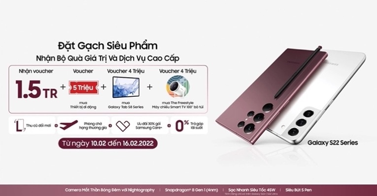 Từ ngày 10-16/2, khách hàng khi đặt mua trước Samsung Galaxy S22 series sẽ có cơ hội nhận được bộ quà tặng trị giá lên đến 14,5 triệu đồng gồm voucher giảm trực tiếp 1,5 triệu đồng lên sản phẩm, phiếu mua hàng trị giá 5 triệu đồng hoặc thu cũ đổi mới đến 4 triệu đồng. Ưu đãi còn bao gồm loạt voucher giảm giá khi mua các sản phẩm công nghệ như Galaxy Tab S8 Series, máy chiếu Smart TV FreeStyle.