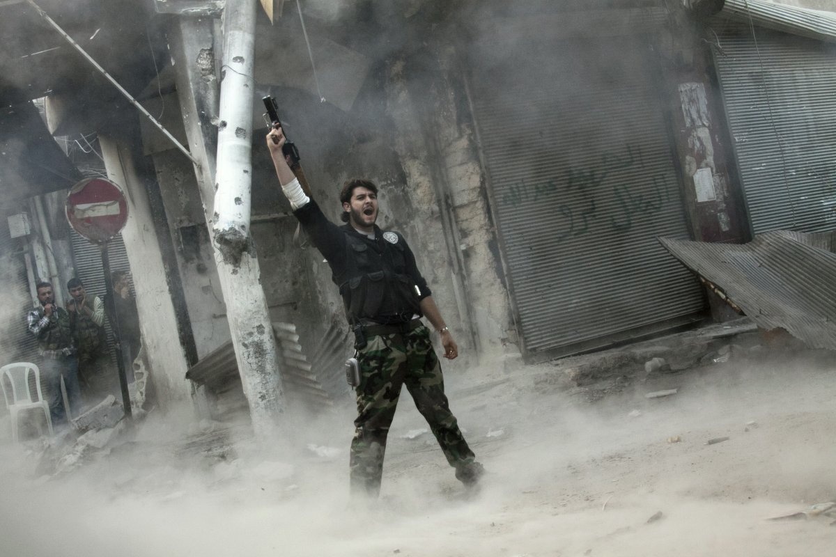 | Binh sĩ quân nổi dậy thể hiện sự vui sướng sau khi bắn một quả đạn pháo vào ngôi nhà mà quân chính phủ ẩn nấp tại Jedida, Aleppo ngày 4/11/2012. |
