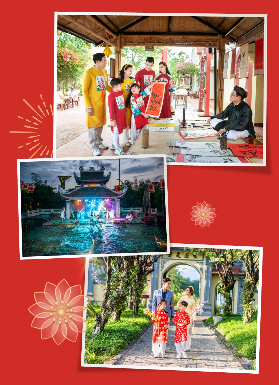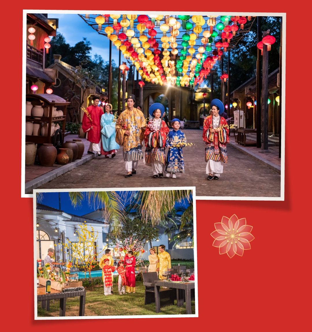 Resort riêng tư đưa du khách đến với kỳ nghỉ Tết lý tưởng nhưng vẫn đong đầy nét đẹp truyền thống. Ở đó, bạn dễ dàng tham gia hoạt động gói bánh chưng, bánh tét đón giao thừa, xin chữ đầu năm, xem múa Lân sư rồng, chơi trò chơi dân gian. Du khách nhí được học cách làm phong bao lì xì, gấp hoa… để thỏa sức sáng tạo.