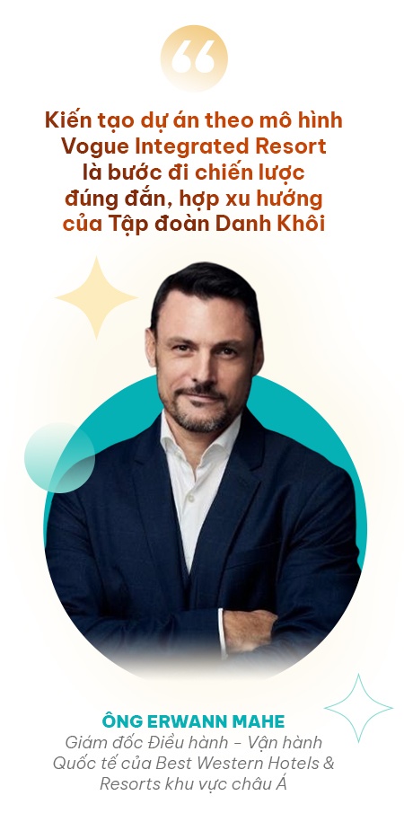 “Kiến tạo dự án theo mô hình Vogue Integrated Resort là bước đi chiến lược đúng đắn, hợp xu hướng của Tập đoàn Danh Khôi. Khi kết hợp cùng Best Western Hotels & Resorts, giá trị này sẽ được tăng lên, tối ưu hoá sự hài lòng của du khách, mang đến những trải nghiệm vượt mong đợi, hướng đến giá trị cảm xúc và luôn không ngừng cải thiện chất lượng dịch vụ”, ông Erwann Mahe nhấn mạnh.