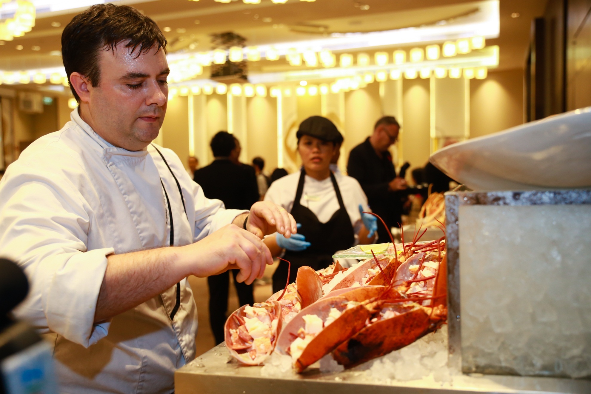 Nhân viên đang sắp xếp khu vực đặt món tôm hùm. Tại lễ hội, thực khách được thưởng thức nhiều đặc sản Canada như thịt bò, tôm hùm, ốc vòi voi, hàu...