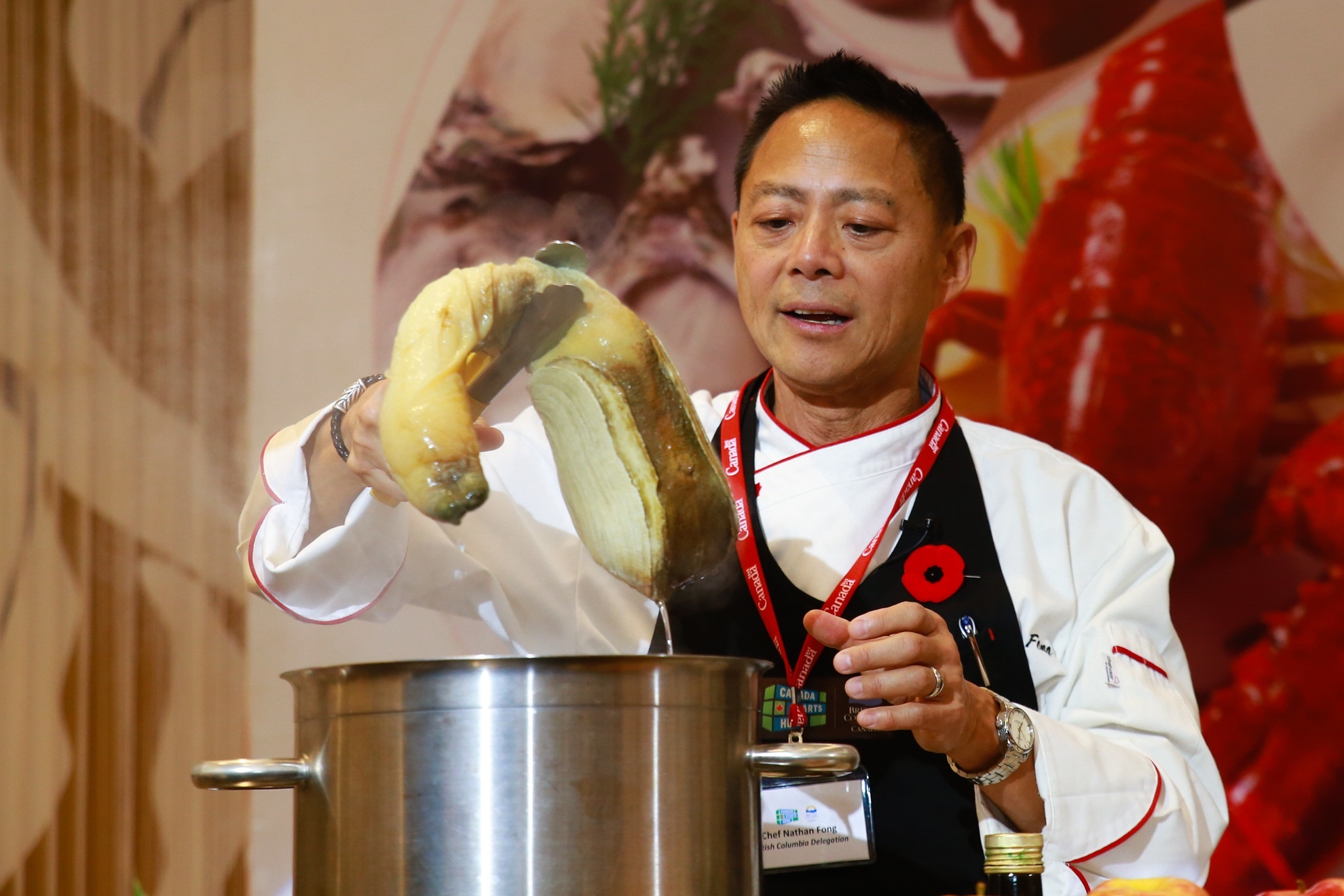 Đầu bếp, chuyên gia ẩm thực người Canada Nathan Fong đã trình diễn cách chế biến món ốc vòi voi, một trong những đặc sản đắt giá của quốc gia Bắc Mỹ.