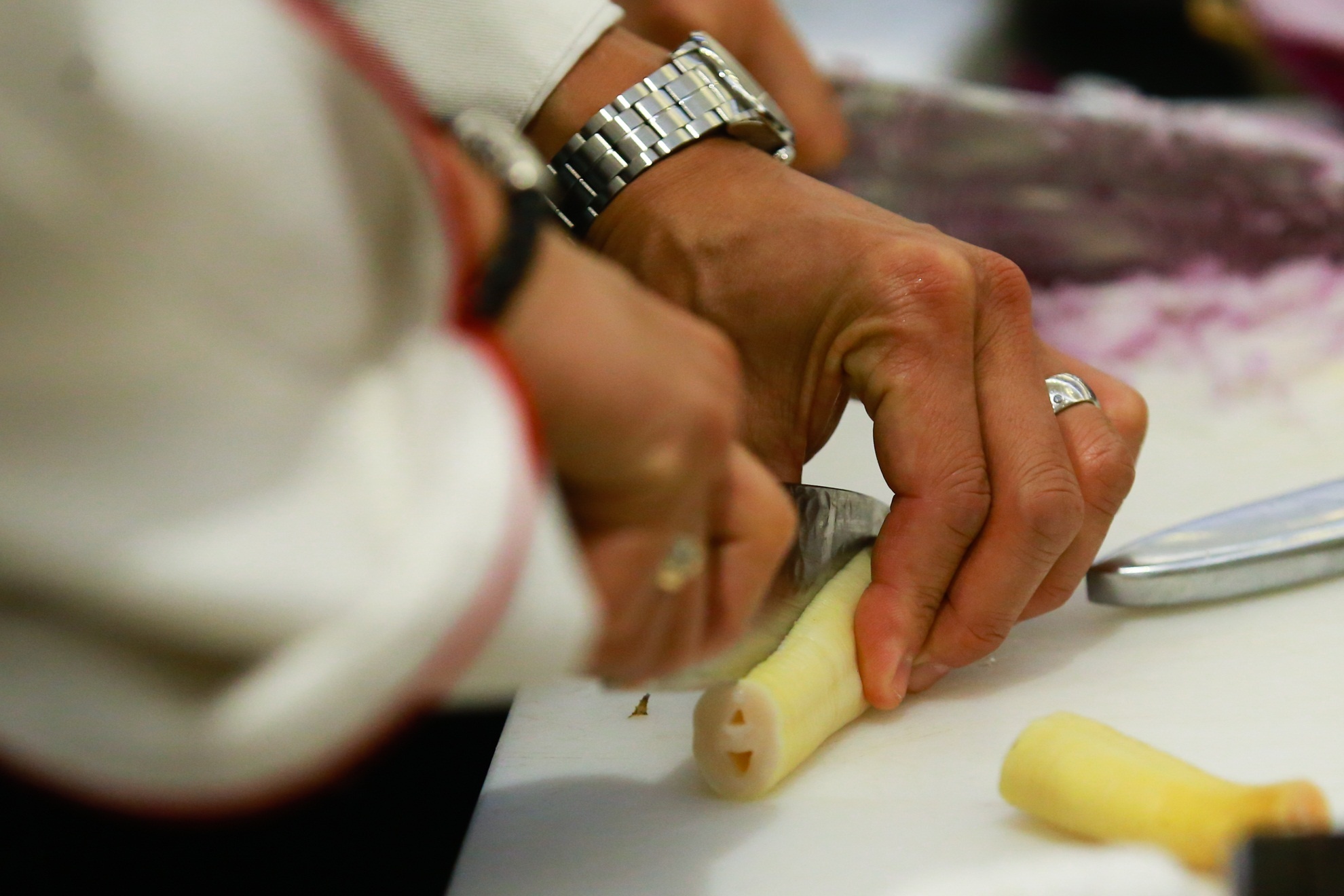 Bộ trưởng Thương mại quốc tế bang British Columbia Teresa Wat hào hứng tham gia chế biến món ăn cùng đầu bếp Nathan Fong.