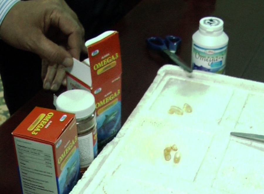 Chi cục đã thử nghiệm, đối chiếu sản phẩm omega-3 xuất xứ từ Trung Quốc và Mỹ trên miếng xốp trắng. Kết quả, chưa đầy 10 phút, sản phẩm dầu cá Trung Quốc ăn mòn và gây thủng miếng xốp. Còn viên dầu cá của Mỹ thì không xảy ra phản ứng.